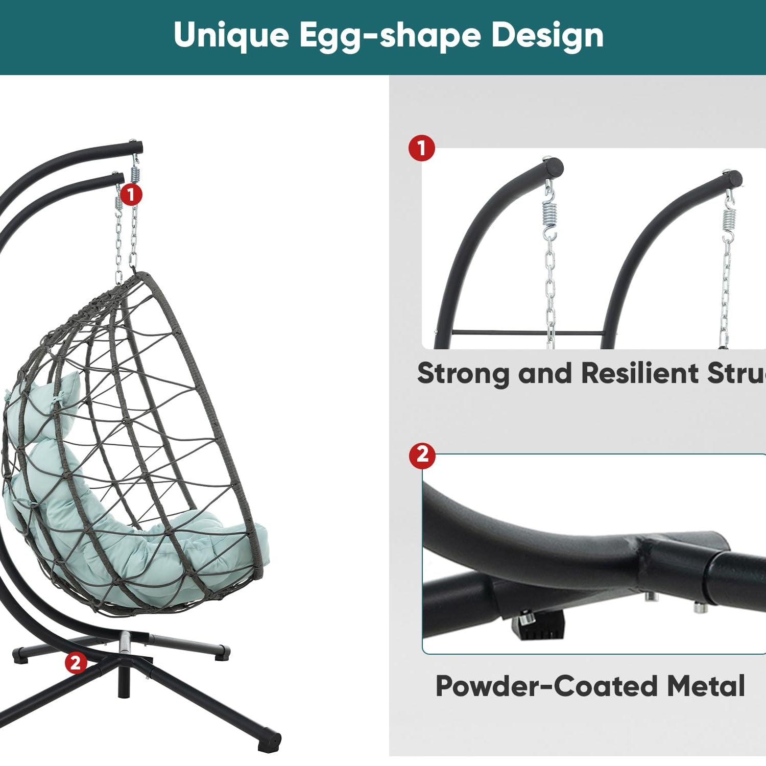 - INDOOR-OUTDOOR USE: Weather-resistant materials mean this egg swing chair is happy on your patio or in your living room. Anytime, anywhere relaxation at your fingertips