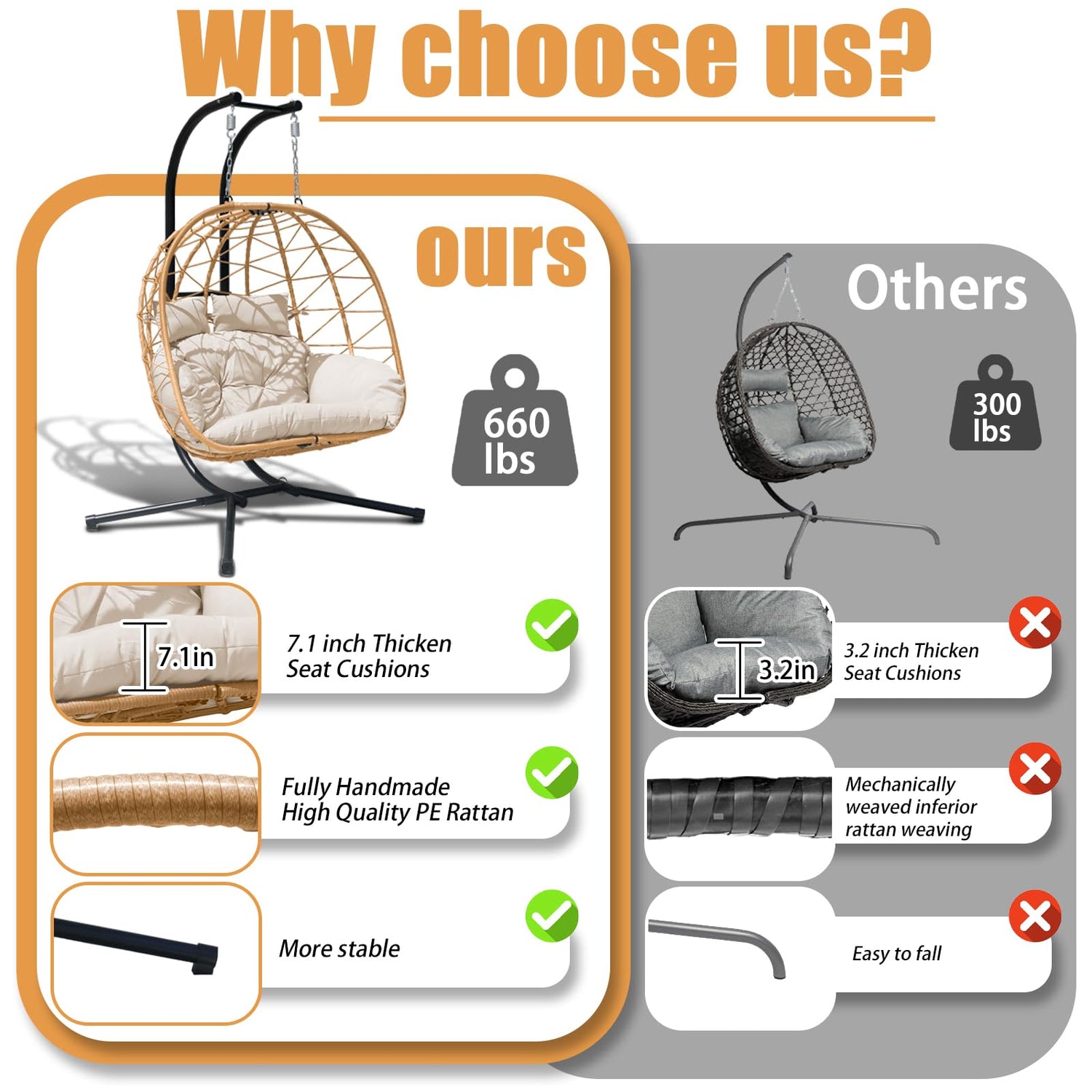 - 【Premium Heavy-Duty Construction】Nevsokio's double egg swing chair features a sturdy iron frame with thicker pipes for enhanced stability and safety, supporting up to 600 lbs. The powder-coated steel stand and hand-woven all-weather PE rattan ensure durability against rust and weather, making it perfect for long-term use as an outdoor egg chair swing or indoor cozy reading chair.