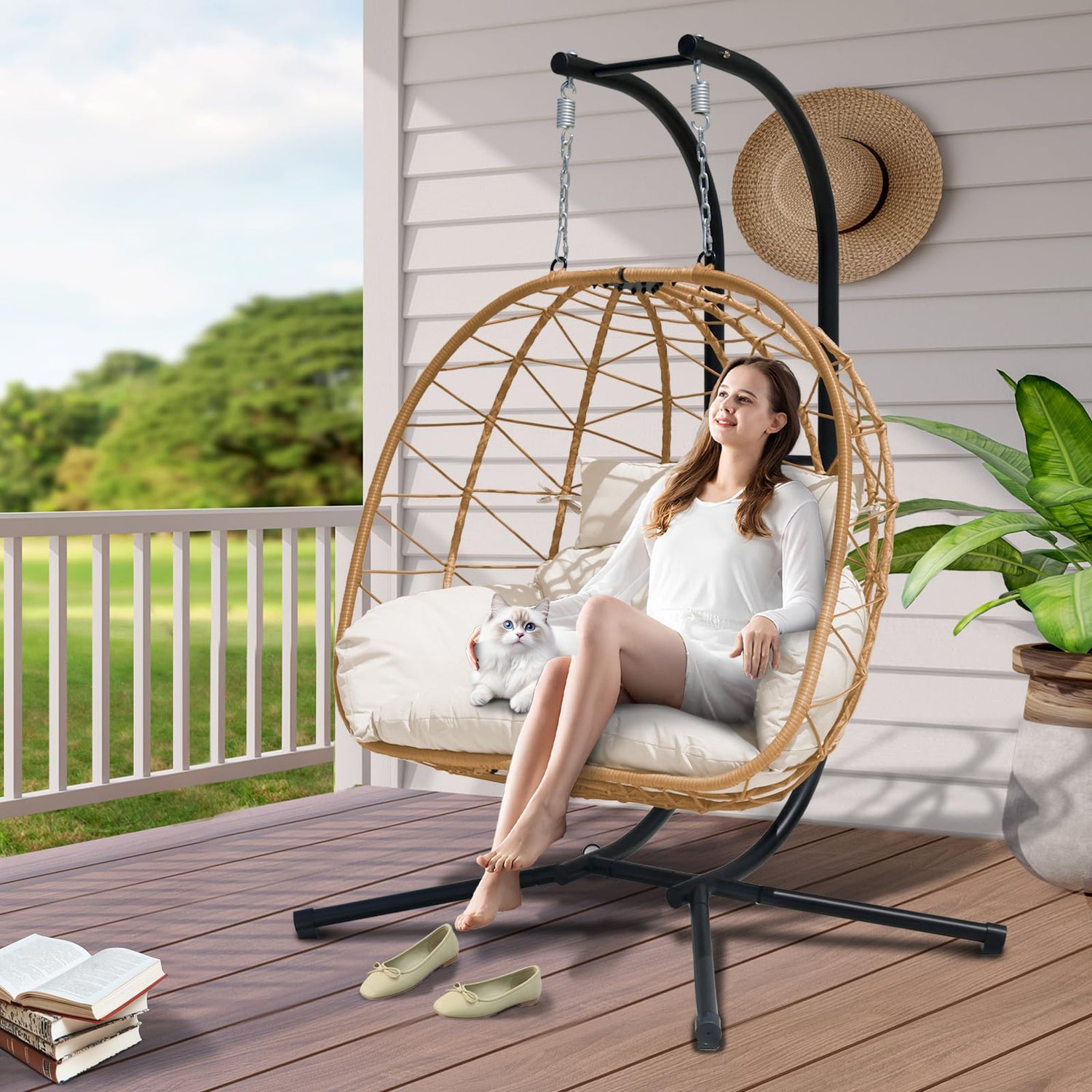 - 【Versatile Indoor & Outdoor Use】Designed as both a patio swing and balcony furniture set for apartments, this hanging chair with stand fits seamlessly in gardens, bedrooms, living rooms, or poolside areas. No ceiling mounting needed—just assemble the stand and enjoy your outdoor love seat or adult swings for outside.