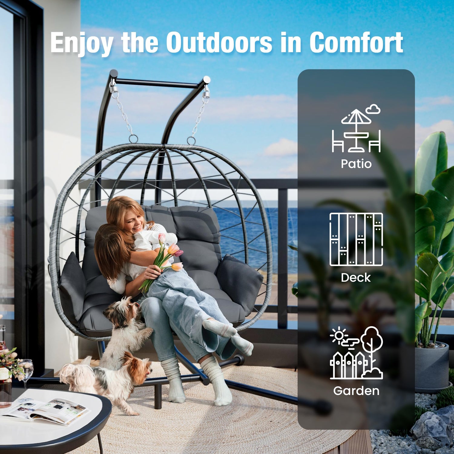 Pamapic Double Egg Chair wth Stand, 700 LBS Loveseat Rattan Swing Chair, UV Resistant Cushions with Armrests and Headrest, Thick Steel Frame Hammock Swing for Outdoor, Patio, Indoor(Grey)
