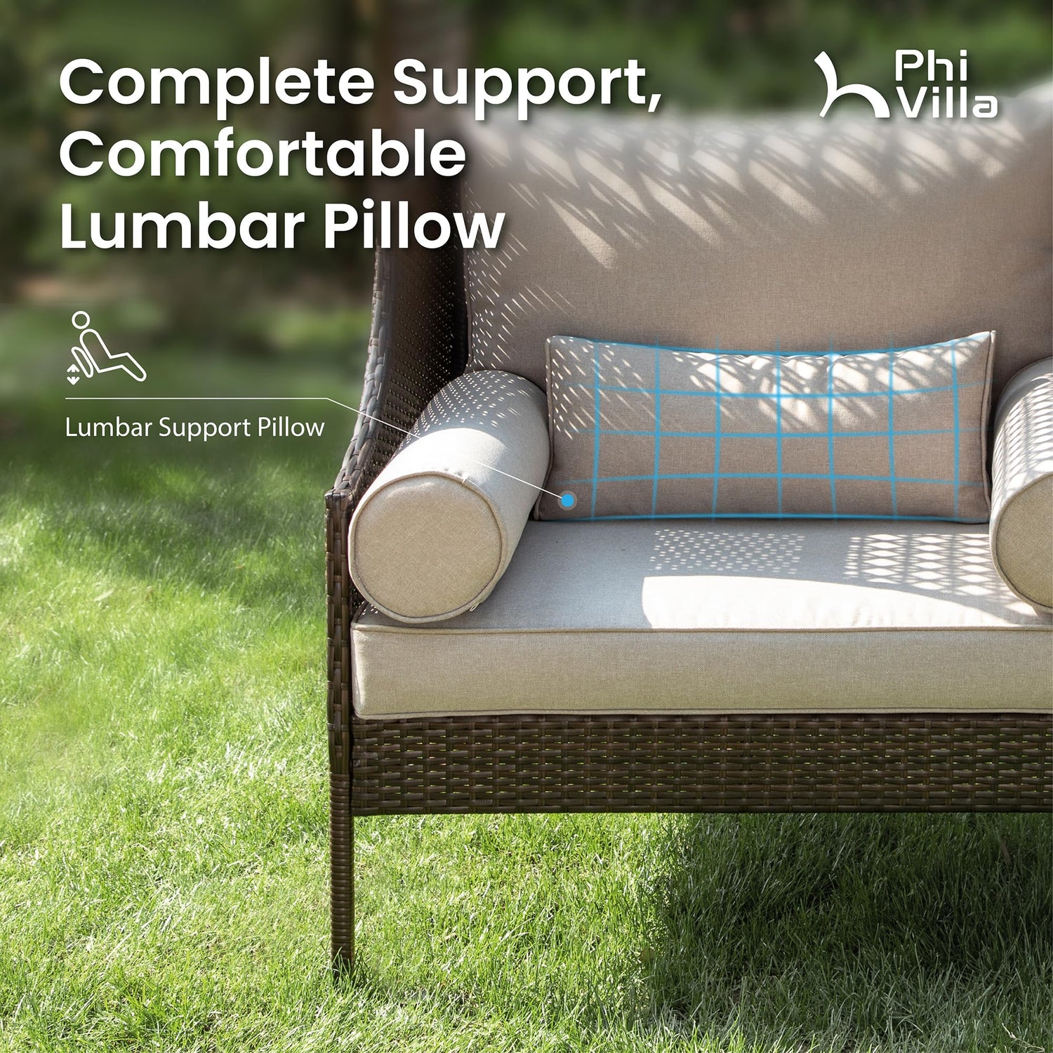 - Thick Cushion & Pillows: Indulge in plush comfort with the 3.9” thick cushioning, enveloped in a waterproof fabric cover that ensures durability against the elements. Equipped with a large lumbar pillow for added support and cylinder handrail cushions for enhanced comfort, it invites you to sink in and unwind in luxurious tranquility.