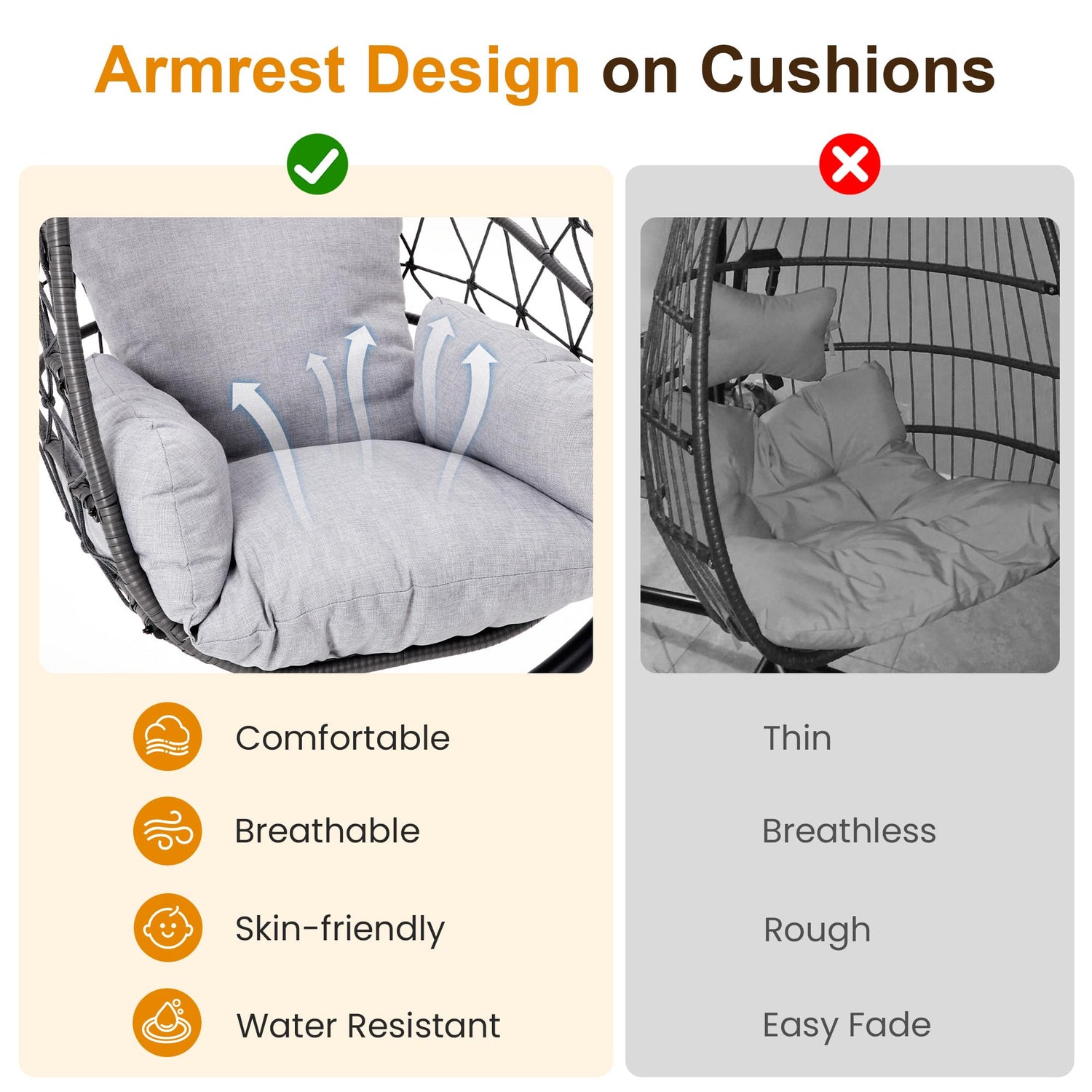 • Exceptional Support: We're committed to delivering top-notch products. If you have any inquiries about the RoyalCraft hanging egg chair, feel free to reach out to us right away. We're here to assist you promptly, address all your concerns, and ensure you have a satisfying patio furniture buying experience.