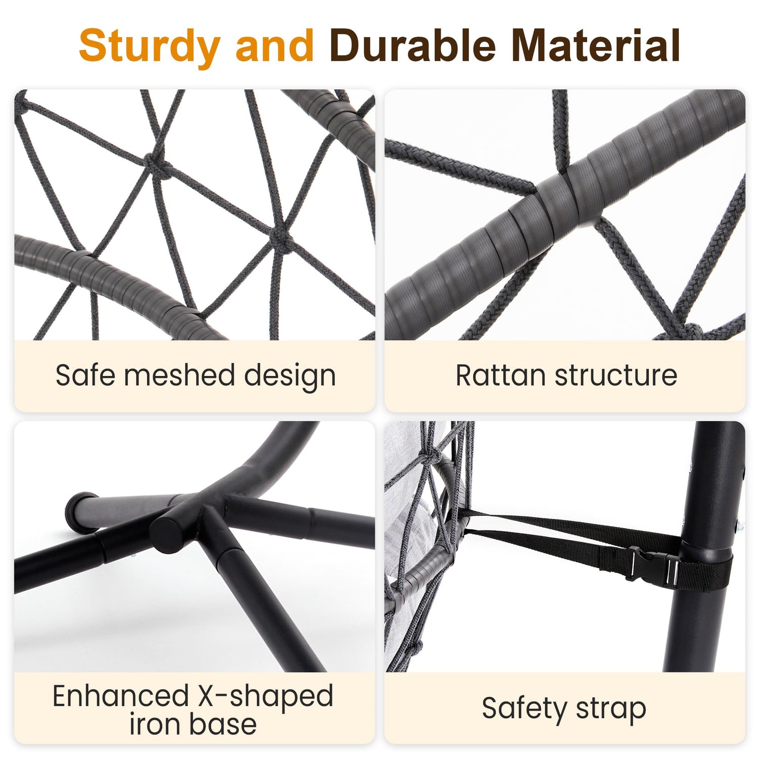 • Sturdy and Durable Design: This hanging chair with stand features a metal frame with a sleek beige spray-coated finish, reinforced by sturdy rattan wrapping, ensuring it remains deformation-resistant. With its triangular base, the chair can support up to 350 pounds, providing a stable and secure seating experience.