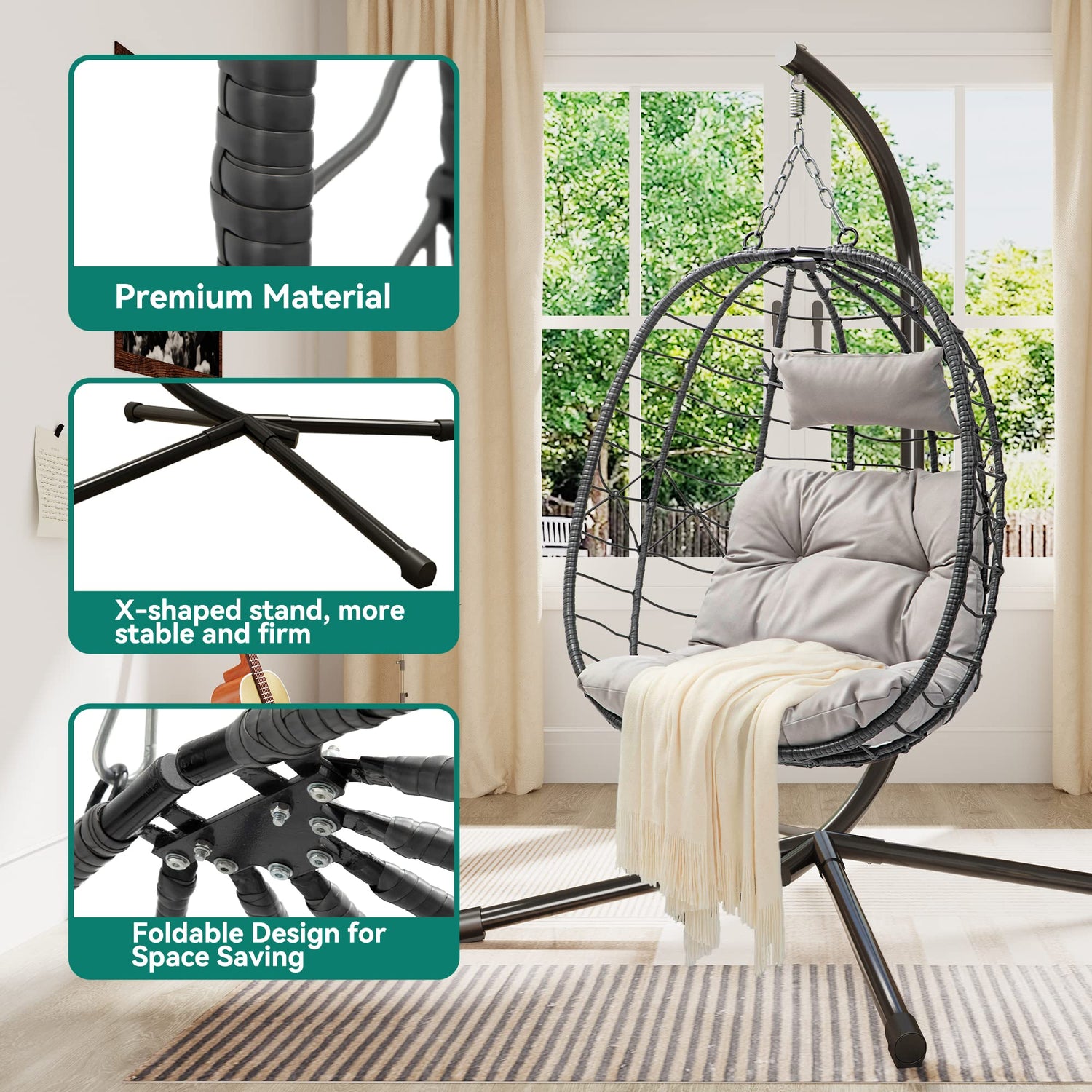 YITAHOME Hanging Egg Swing Chair Outdoor Wicker Hammock Chairs Indoor with Steel Stand UV Resistant Cushion 350lbs for Patio, Bedroom, Garden and Balcony, Gray