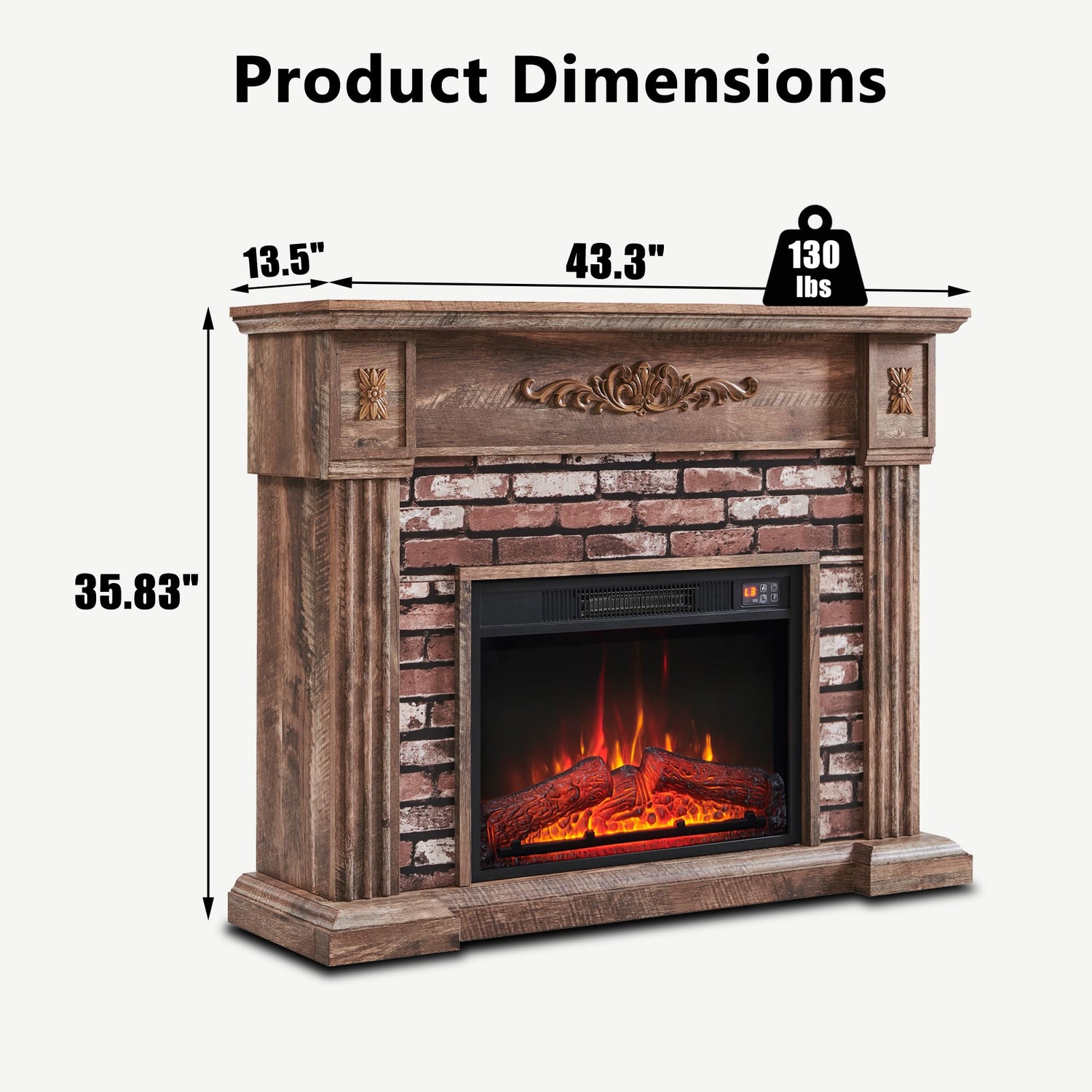 - 【Dimensions】Electric Fireplace with Mantel: 13.5" D x 43.3" W x 35.83" H. Electric Fireplace: 5.15" D x 23" W x 17.1" H. Feel the realistic log burn, enjoy the warmth and create a cozy space while it enhances your living room's décor