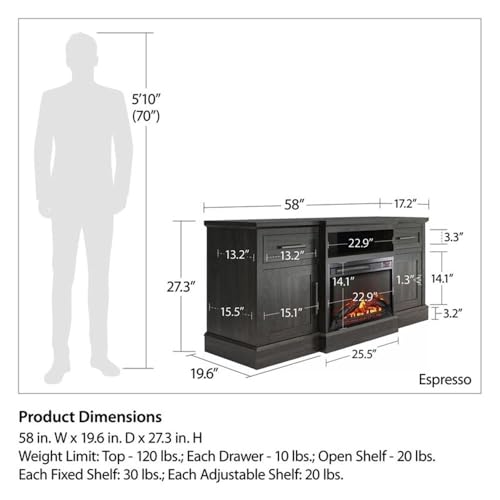 Details: Enjoy the convenience and warmth of a fire from the comfort of your own living room with the Ameriwood Home Gablewood Electric Fireplace & TV Console for TVs up to 65". Made from laminated engineered wood and paired with dark metal accents, the classic look of the Gablewood TV Stand will easily complement most any décor. The 2 drawers with durable metal slides, and 2 cabinets fastened with Euro-style hinges provide plenty of space for storage. Behind the cabinet doors are 2 shelves, 1 fixed and 1 adjustable to store items tall to small, and above the fireplace insert is an open shelf for your components, complete with wire management in the back of the unit. The top of the TV Stand accommodates most flat panel TVs up to 65” wide with a maximum weight of 120 lbs. Enjoy the warmth and atmosphere of an inviting fire with the included 23” electric fireplace insert. This fireplace heats up a room up to 400 square feet and includes 3 different flame settings which are controlled from either the touch panel or the remote control. The heating unit can be turned off while the flames are still on, so you always have the ambiance you desire in your living room, sitting room or family room. Two adults are recommended for proper assembly. Once assembled, the Fireplace TV Stand measures to be 58" W x 19.1" D x 27.3" H.
