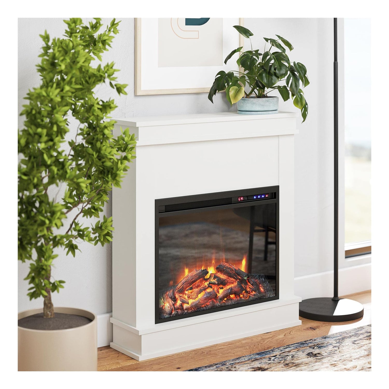Ameriwood Home Mateo 30 Inch Electric Fireplace with Mantel, Replaceable Fireplace Insert Heater, Freestanding, Remote Control, Timer, Realistic Log and Flame Effect, White