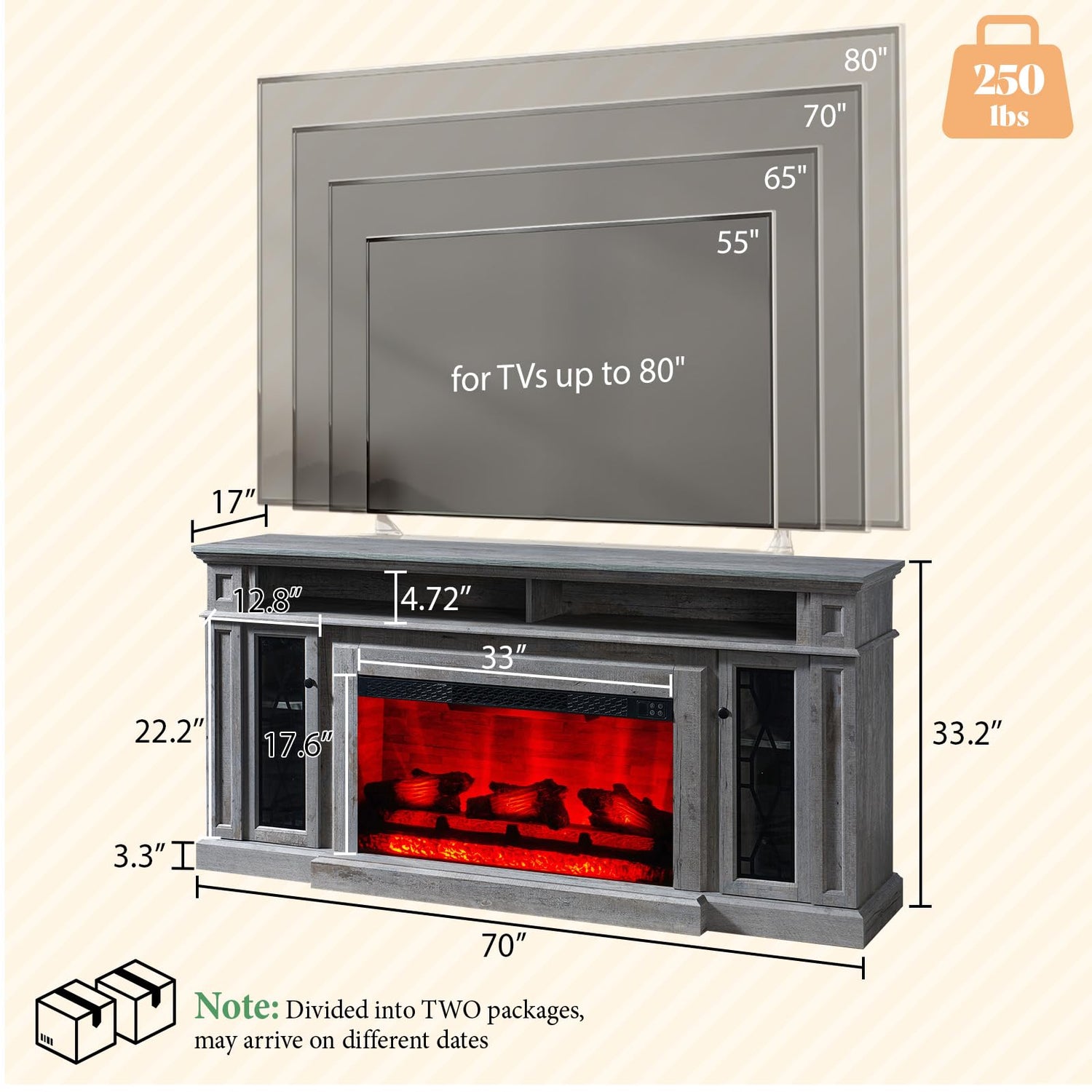 AMERLIFE 70" Farmhouse Heavy Fireplace TV Stand with 33" Electric Fireplace, for 80" TVs up, Media Entertainment Center with Diamond Door, TV Console Storage Cabinet for Living Room, Grey