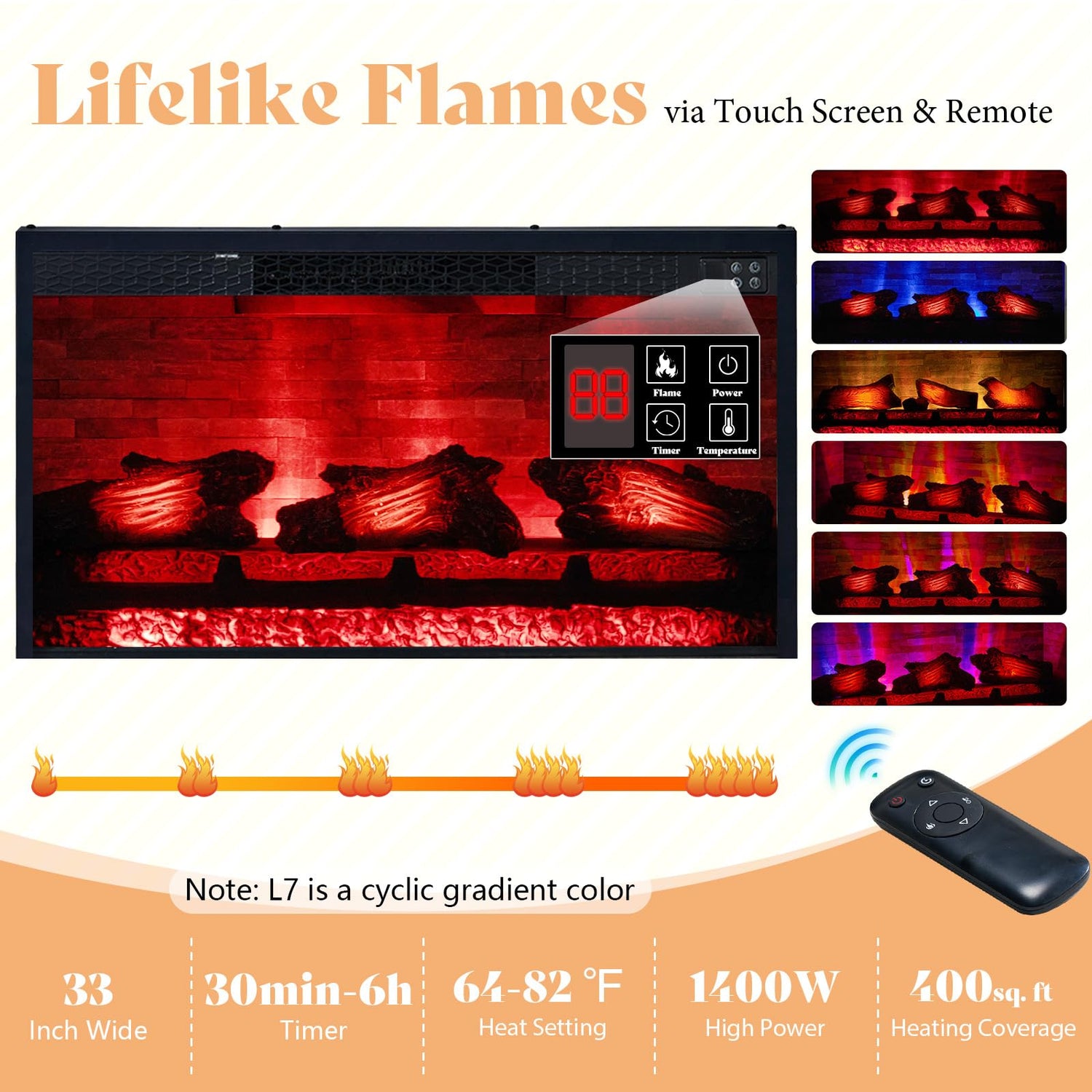 - 33" WIDE FIREPLACE: 33in detachable fireplace enhances the integrity and aesthetics of the entire product. Unique brick wall backdrop enhances the realism of the burning process of simulated logs. 6 flame colors, 5 levels of brightness,m 0.5-6h Timer, 64-82℉ temperature adjustment, easy operation via touch screen & remote