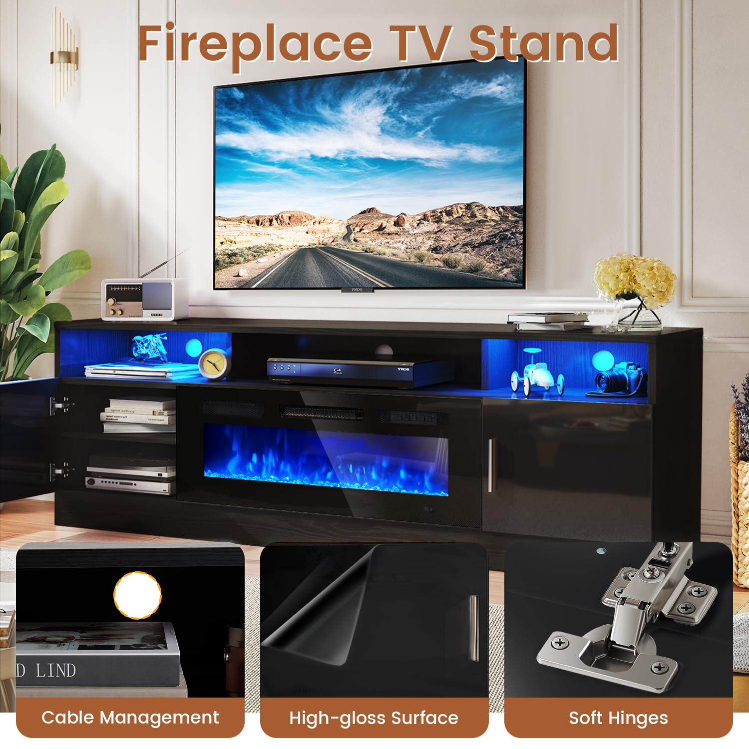 Breezestival 70" Fireplace TV Stand with Two Hinged Doors for TVs UP to 80", Electric Fireplace Entertainment Center with LED Lights & Storage Cabinets, TV Console for Living Room, Black