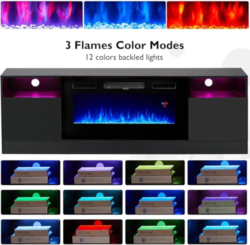 Breezestival Fireplace TV Stand with Two Hinged Doors for TVs UP to 80", Modern Electric Fireplace Entertainment Center with LED Lights & Storage Cabinets, TV Stand for Living Room 70" Black 21007BK