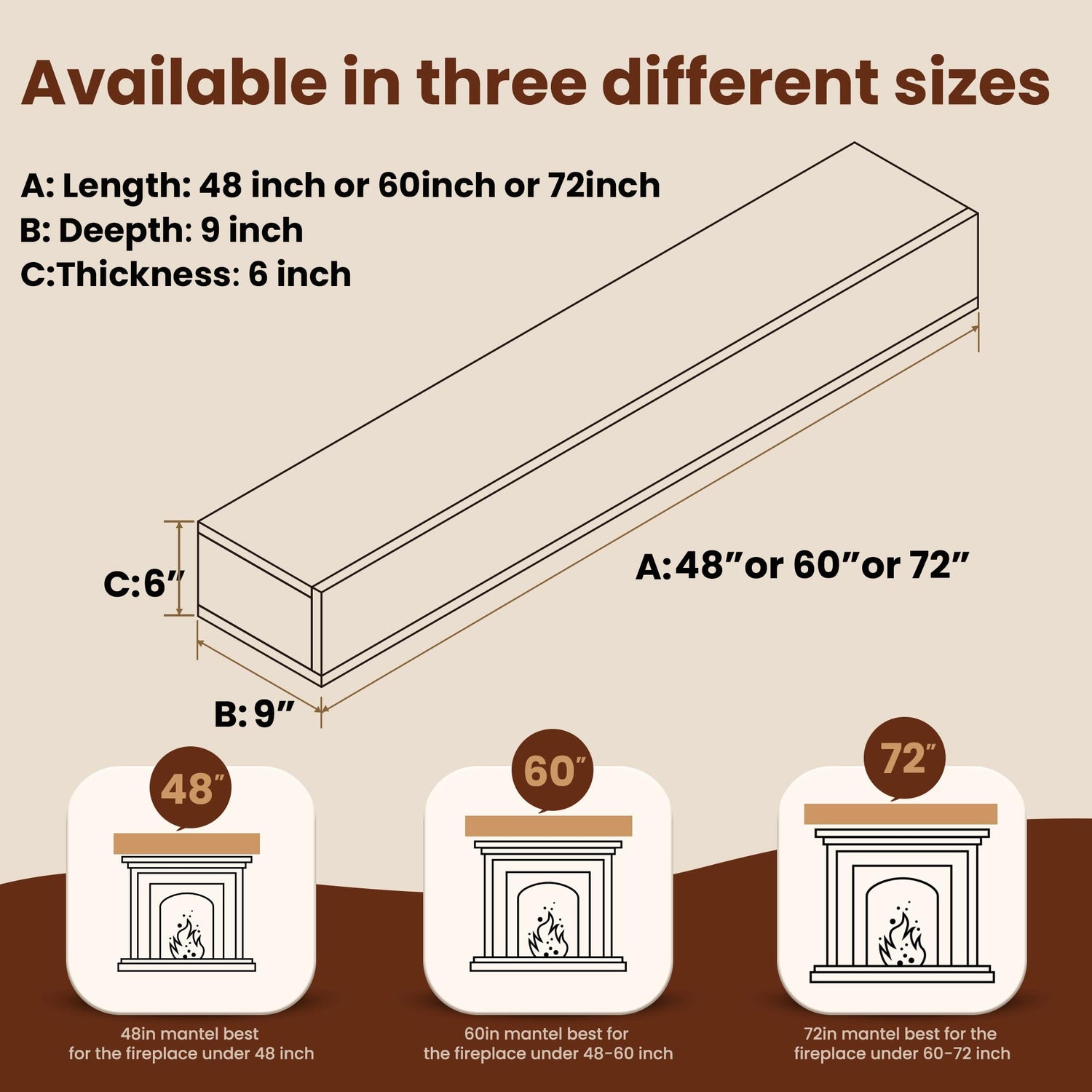 - Dimension: Measuring 72" long, 6" high and 9"deep, this fireplace mantel is the perfect size for most standard fireplaces. It can support up to 60lbs, making it ideal for displaying your favorite decor items.