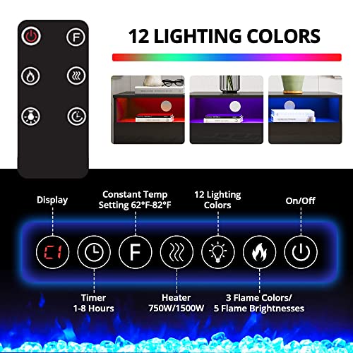 - 12 Colors LED Backlight:Transform your living room with the fireplace entertainment center's adjustable LED lighting system.Choose from 12 vibrant colors and 3 mesmerizing flame styles to create the perfect atmosphere for movie nights or gaming sessions.Adjust the flame brightness for an immersive experience that rivals your favorite theater