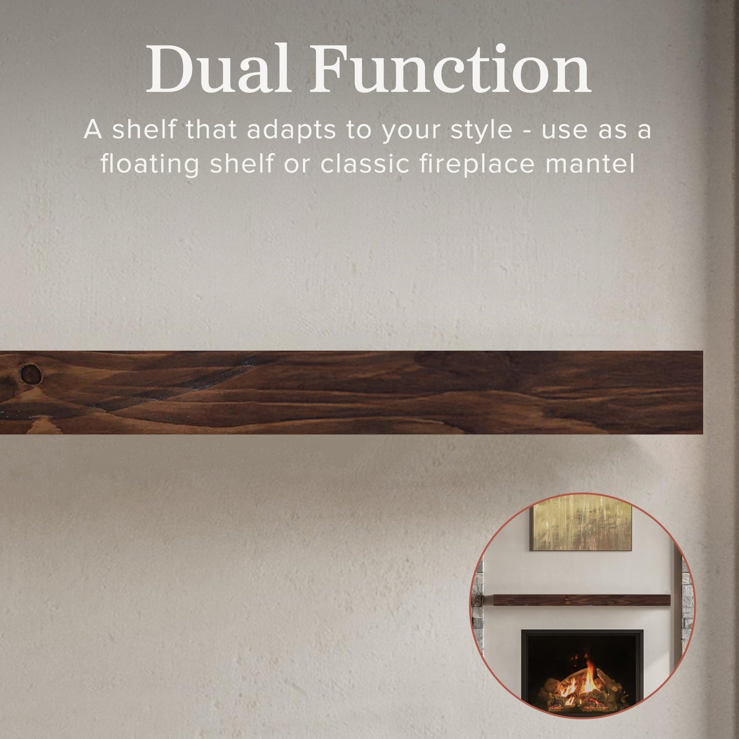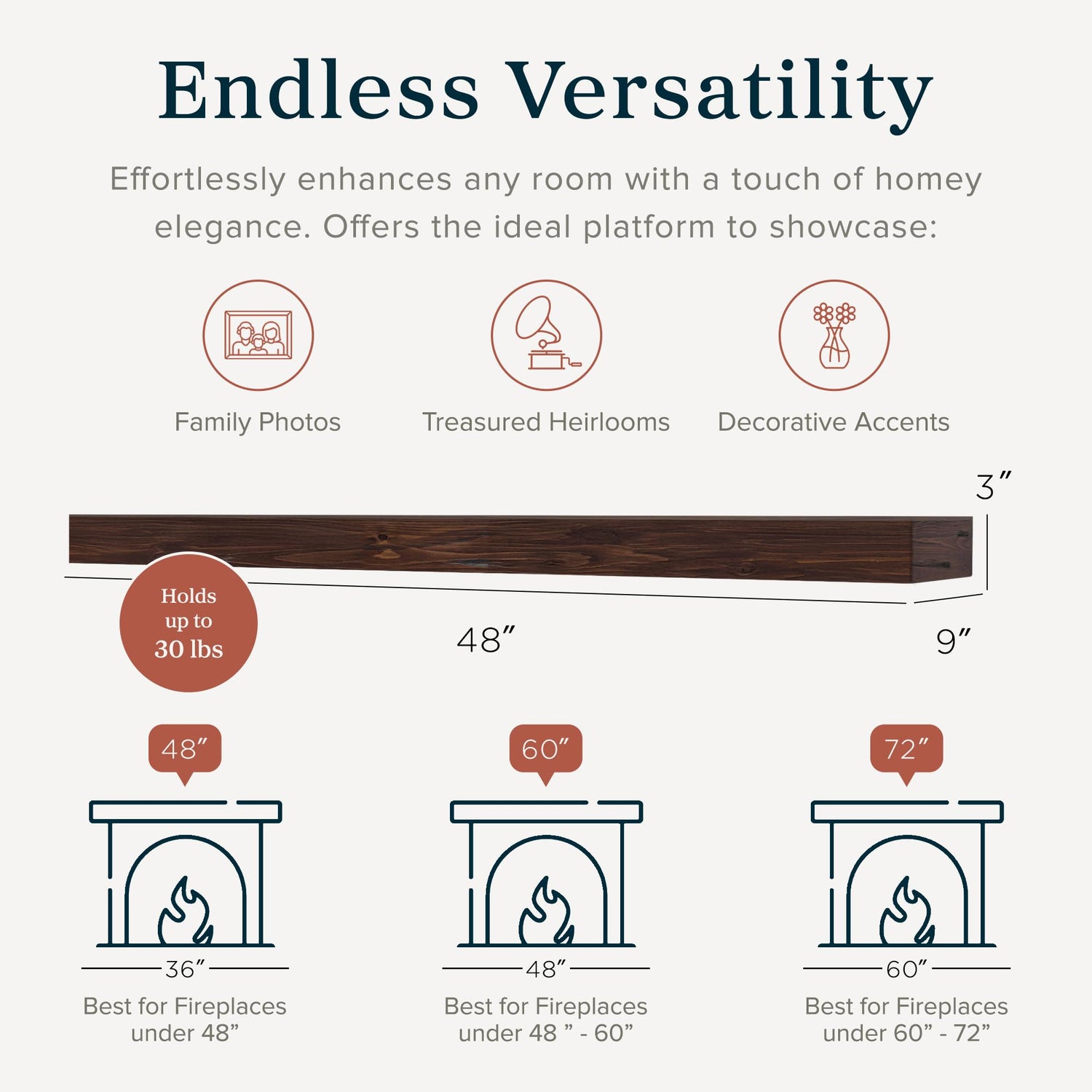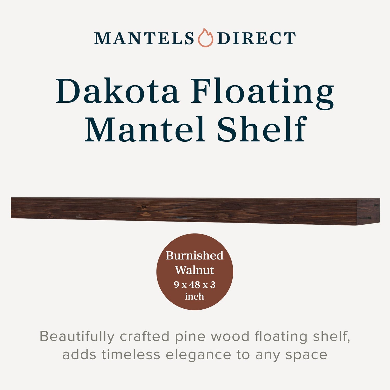 Dakota 48 Inch Floating Fireplace Mantel Shelf | Burnished Walnut | Handcrafted Natural Pine Wood Shelves | Rustic Farmhouse Wall-Mounted Mantel for Fireplaces & Home Decor | 48” W x 3” H x 8” D