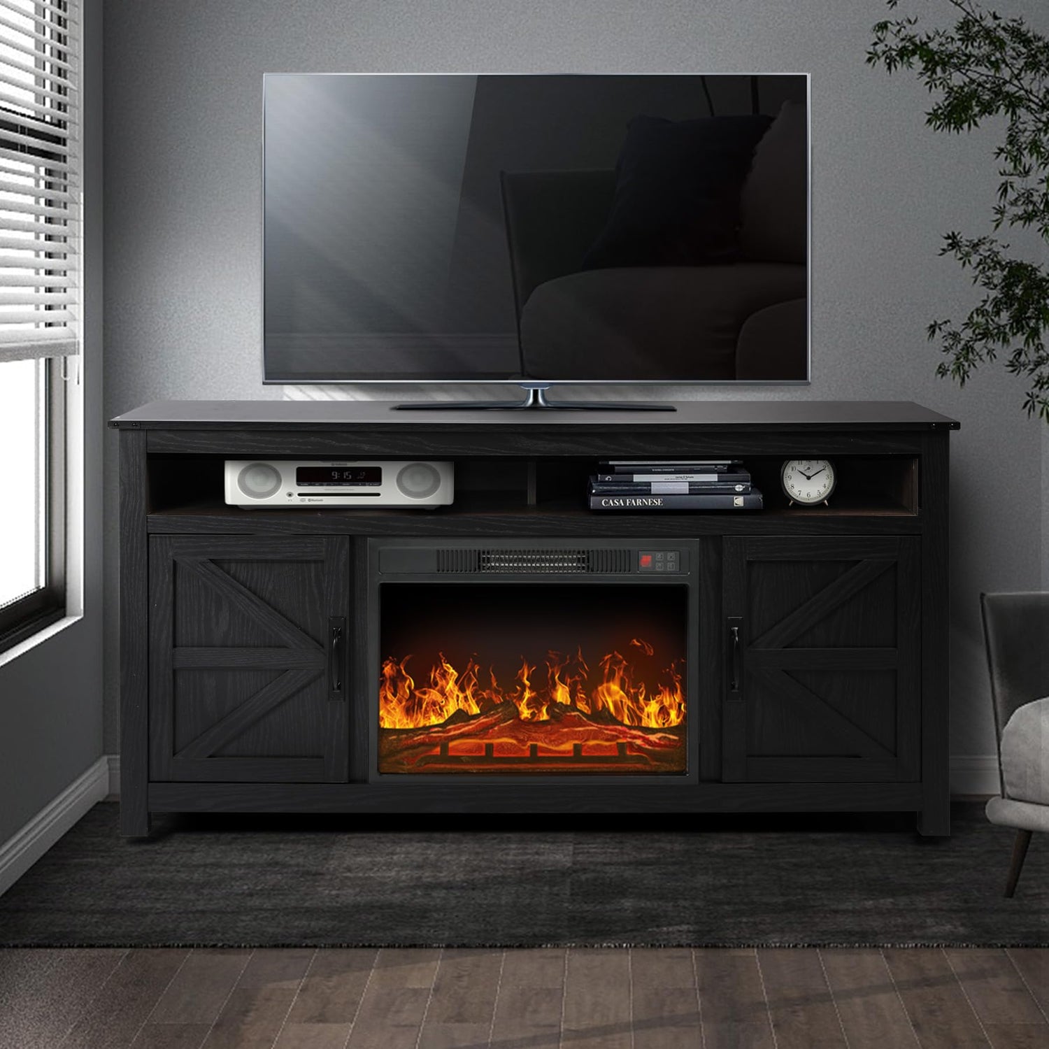 - Electric Fireplace with Remote Control : This electric fireplace excels in heating efficiency, safety, and cleanliness. It plugs into a standard 120V outlet, heats up to 400 sq. ft., and creates a cozy atmosphere with a vivid flame effect