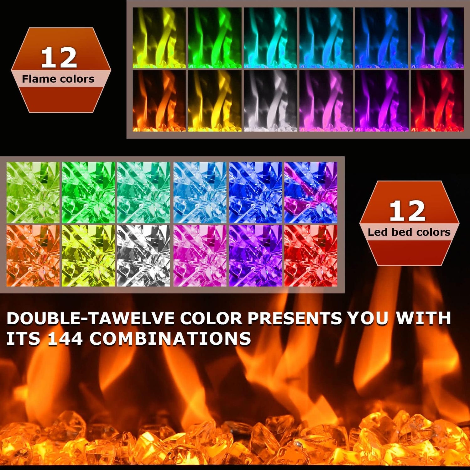 Flame color: 12 flame color +12 LED flame bed color available