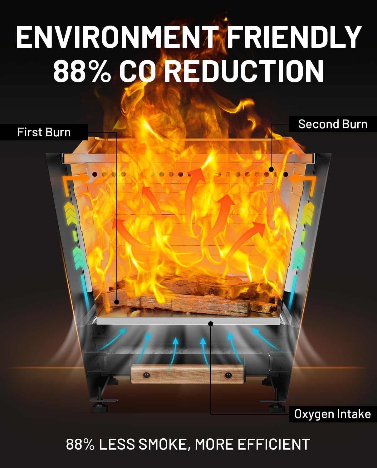 • Low Smoke Design: Smokeless Fire Pit features scientific internal airflow system and double wall design with top vent holes for oxygen to feed the fire from below, promotes better airflow and secondary combustion, provides you with a clean flame atmosphere. No more eye-stinging smoke, increase combustion efficiency by 88% compared with other stoves