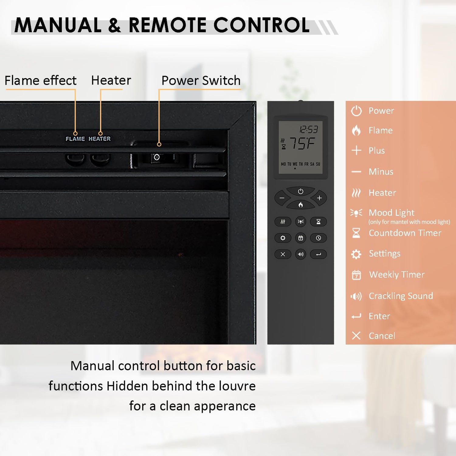• Safe to mount a TV above the fireplace. Quiet fan heater operation heats room from 60℉ to 84℉ (16℃ to 28℃) up to 400 square feet.