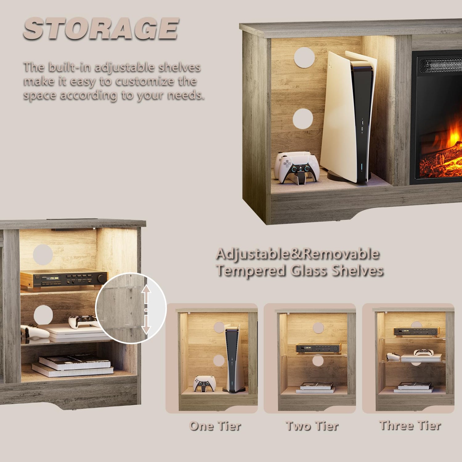 LEMBERI 58 Inches Fireplace TV Stand for TVs up to 65 Inches Console with 18'' Electric Fireplace & Remote, Wooden Modern Entertainment Center for Living Room with LED Light Glass Shelves (Grey)