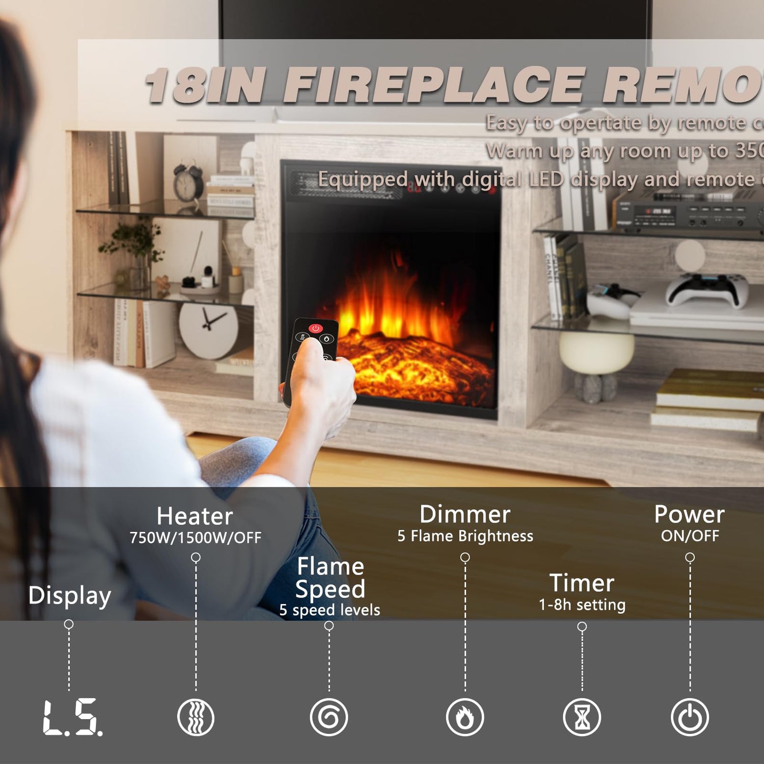 • :TV Stand with Electric Fireplace: The TV stand perfectly combines a 58 inch TV cabinet with an 18 inch electric fireplace. It can heat rooms up to 350 sq. ft and can be chosen from 5 temperature settings (65°F to 95°F),also includes a 1-8 timer. The 3D realistic flame effect can be operated with or without heat to create a warm atmosphere. The flame can not be changed color, but it can be changed brightness,from L1 to L5 level. It is equipped with digital LED display and remote control, can be operated remotely or by the button attached to the fireplace. Conveniently and easily to understand.
