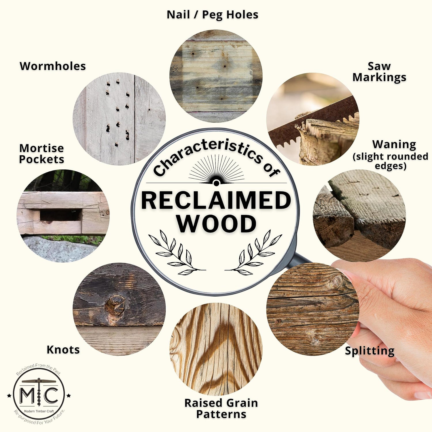 Characteristics to be expected: Hand Hewing (axe marks) Saw Markings Waning (slight rounded edge) Knots Raised Grain Patterns Nail Holes Peg Holes Mortise Pockets Wormholes