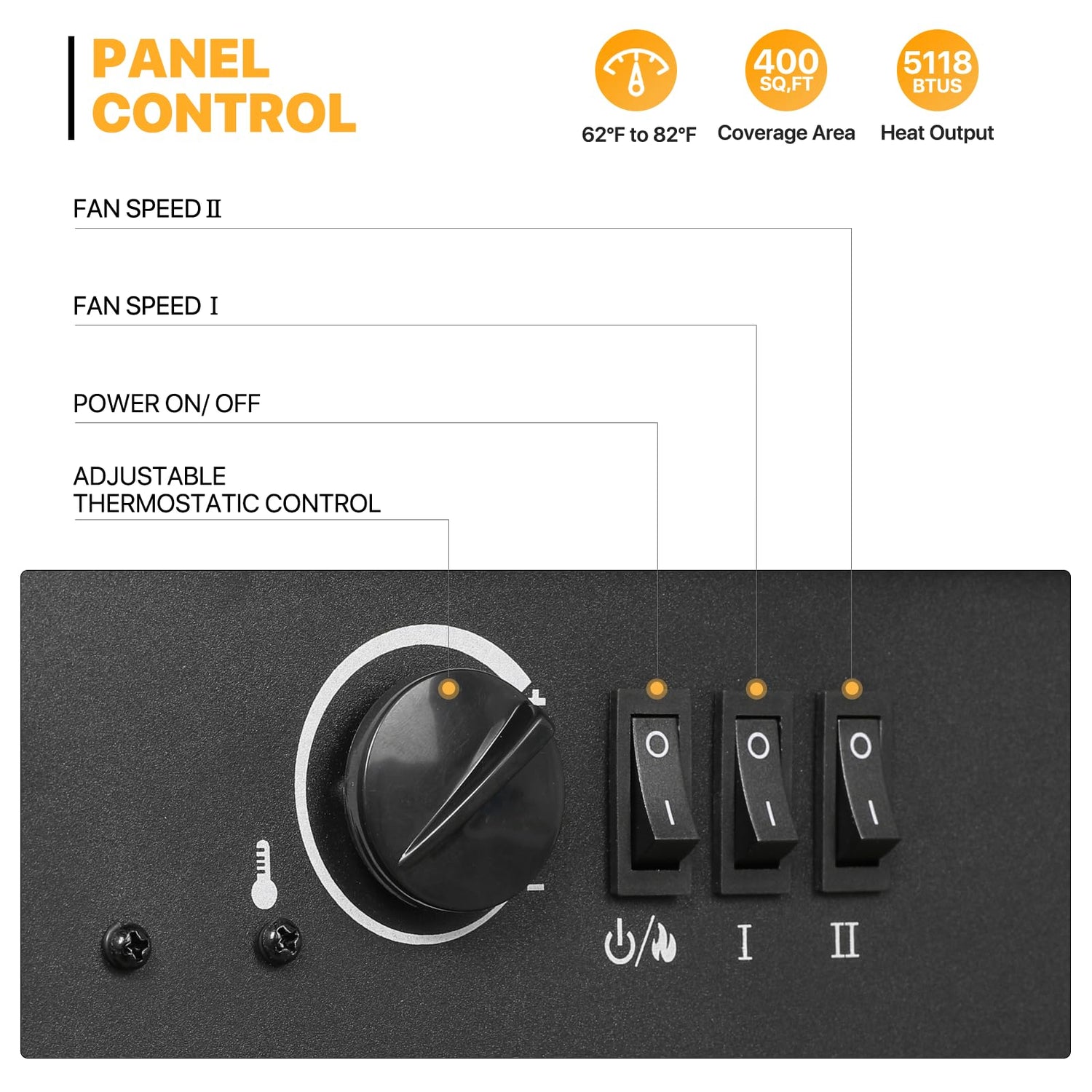 • Effortless Temperature Control - Effortlessly heat spaces up to 400 square feet with our innovative electric fireplace heater. Offering a temperature range from a cozy 62°F to a warm 82°F, it allows you to dial in your ideal comfort level.