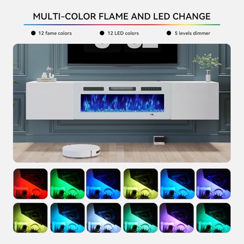 MXV 70'' Floating TV Stand, Modern Media Entertainment Center with 36" Electric Fireplace, TV Console Cabinet Wall Mounted, Adjustable 12-Color LED Lights, for Living Room, White + White