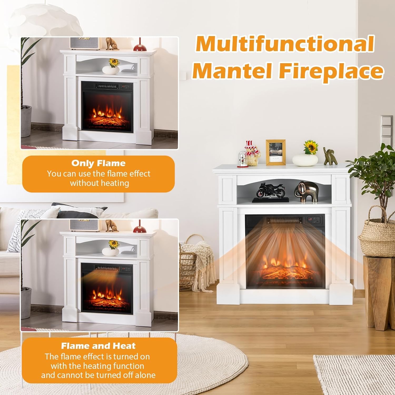 OFFICEJOY Electric Fireplace with Mantel, 32’’ Freestanding Fireplace Realistic Flame with Thermostat, 3 Brightness & Remote Control, Electric Fireplace Heater with Temperature Control & Timer (White)