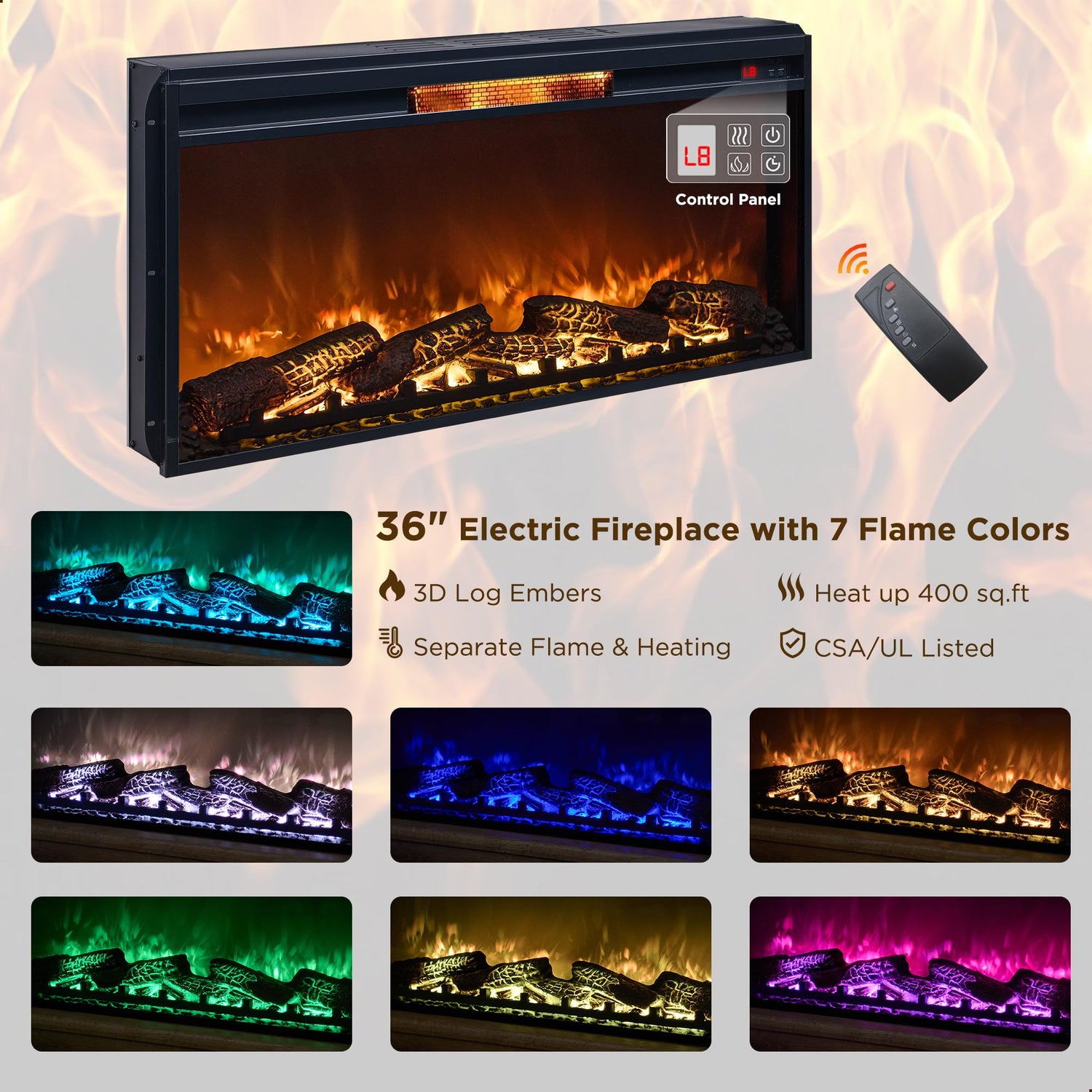 - Powerful Electric Fireplace: This electric fireplace featuring 7 delightful lighting options and a lifelike 3D charcoal effect that creates a warm and inviting ambiance. The timer allows you to set it for durations ranging from 1 to 8 hours. It operates quietly, with heat and light functioning independently. Capable of heating areas up to 400 square feet, it complies with CSA and UL safety standards, ensuring your peace of mind as you enjoy its cozy atmosphere.