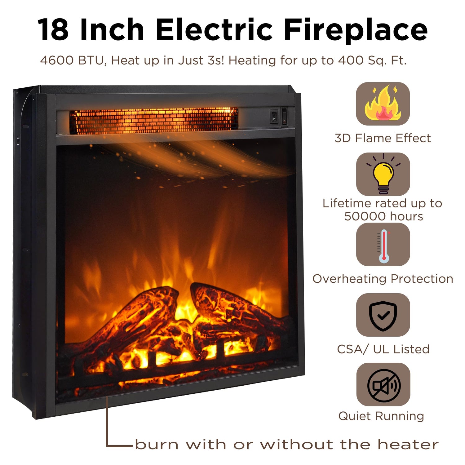- With 18 Inch Electric Fireplace: OKD infrared fireplace heaters feature realistic 3D flame effects, glowing logs, and embers. No firewood, no dust, no smoke, and no cleanup, creating a clean and cozy relaxing space for you. The faux flame effect can be used with or without heat, creating a warm and dreamlike atmosphere all year round.