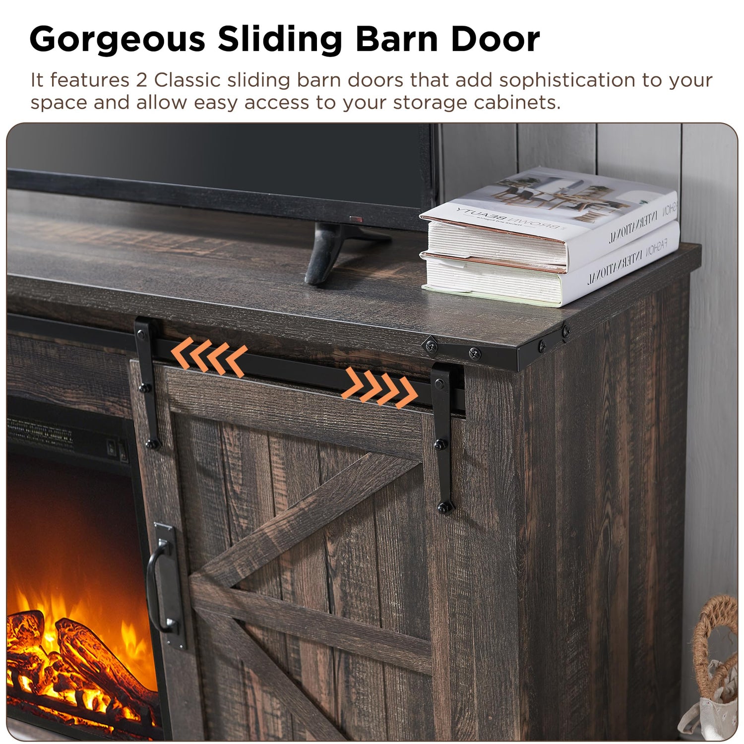 OKD Farmhouse Electric TV Stand for 65+ Inch TV, Rustic Entertainment Center with 18" Fireplace, Sliding Barn Door, Storage Shelves, Wood Media Console Cabinet for Living Room, Dark Rustic Oak