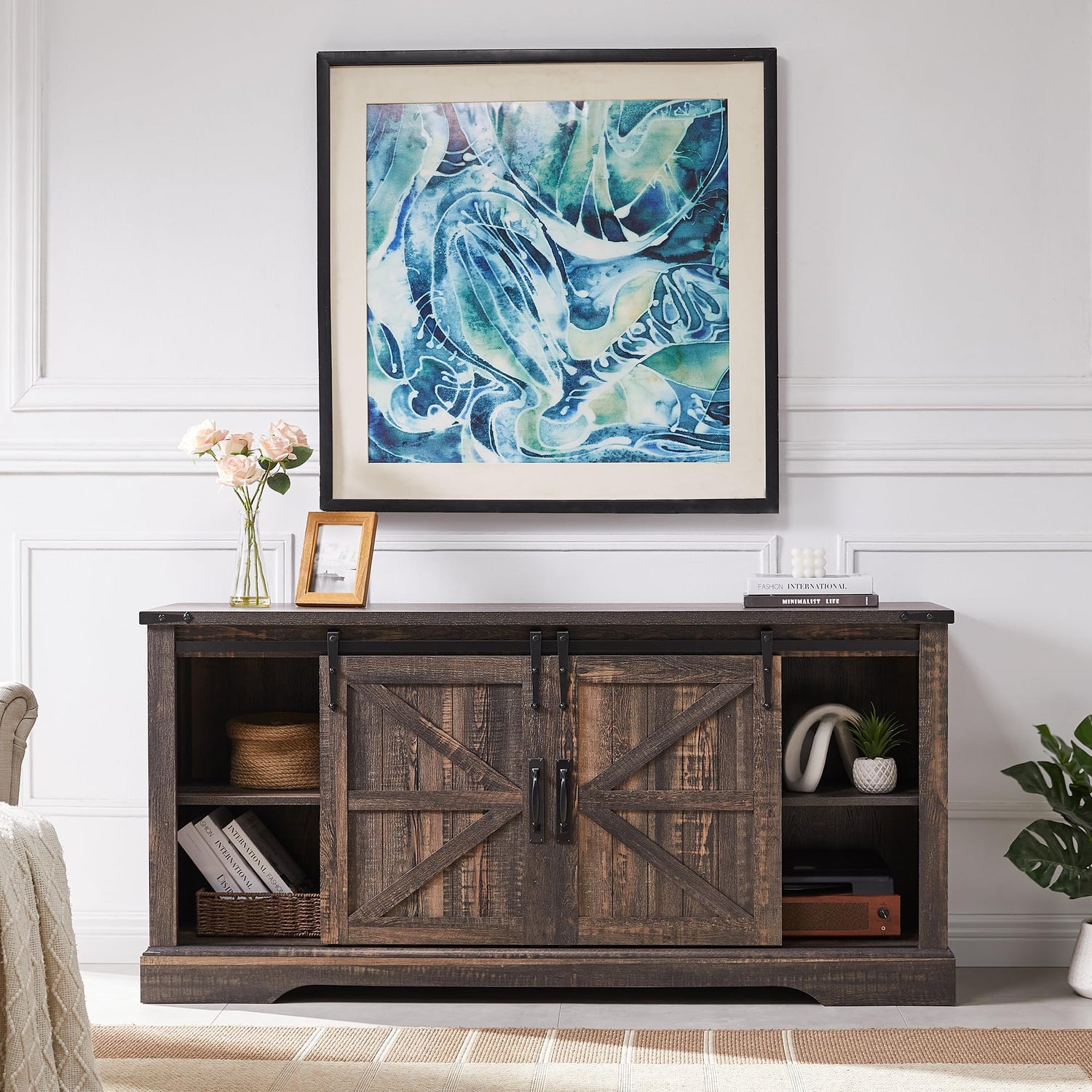 - Ample and Flexible Storage: Classic sliding barn doors add sophistication to the space and allow you to hide clutter behind the doors, keeping the room neat and organized. Each storage cabinet has 1 removable and adjustable storage shelf to fit items of different-sized. 58" wide tabletop fits tv up to 65". Large cable/cord management cutouts to keep electronic wires organized.