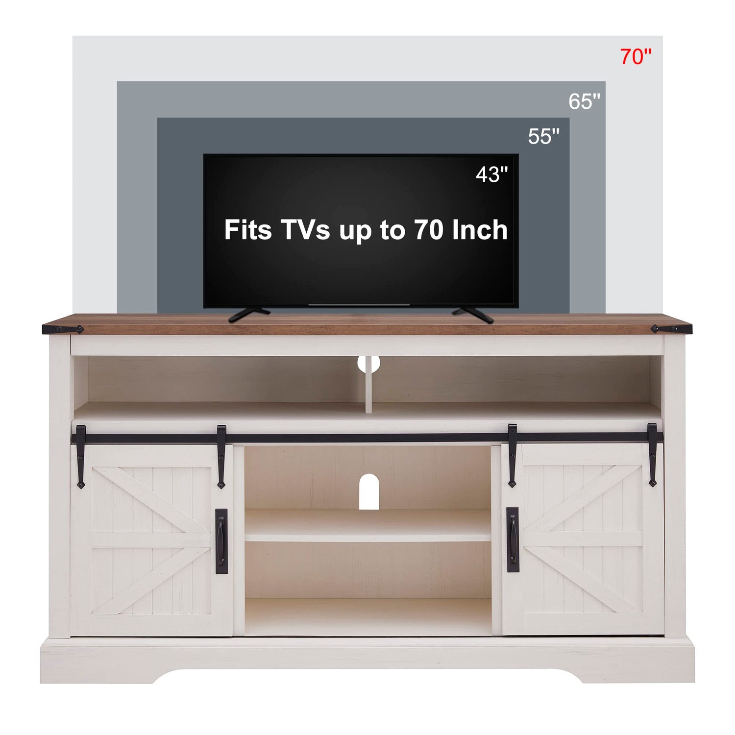 - Ample and Flexible Storage: Design with a 6.3” wide open soundbar shelf above the cabinet, convenient for placing a soundbar or game console. Classic sliding barn doors add sophistication to the space and allow you to hide clutter behind the doors, keeping the room neat and organized. Each storage cabinet has 1 removable and adjustable storage shelf to fit items of different sizes. 60" wide tabletop fits TV up to 70 inches. Large cable management cutouts to keep electronic wires organized.
