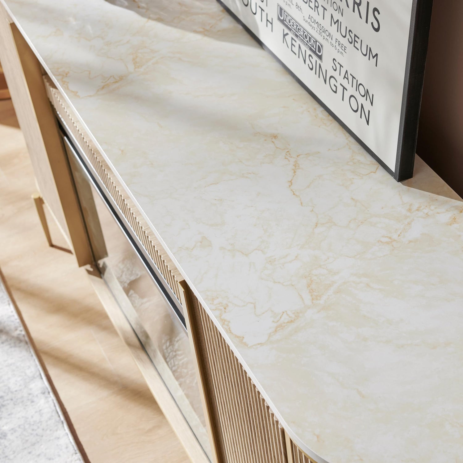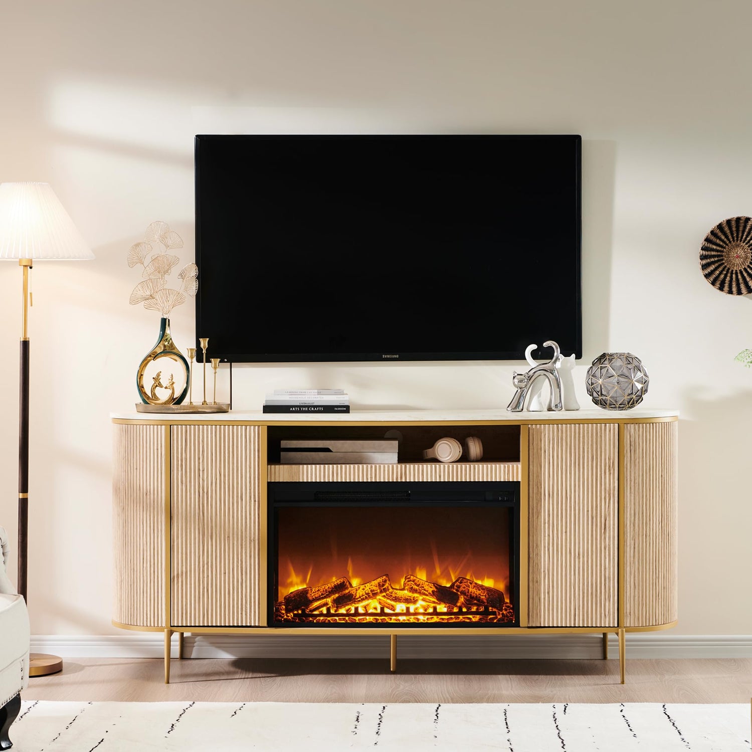 OKD Luxury 70" Fluted Fireplace TV Stand, Modern Chic Entertainment Center for TVs Up to 80 inches, TV Console with Faux Marble Top, Curved Profile Design, Media Console for Living Room, Natural Oak