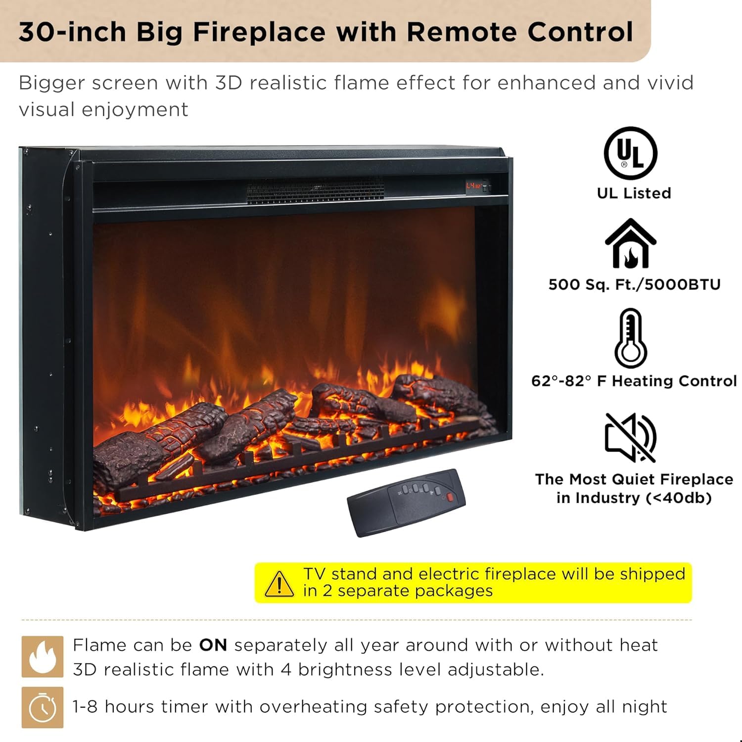 - MODERN REALISTIC ELECTRIC FIREPLACE: The built-in 30-inch electric fireplace brings warmth and ambiance to your living space. Realistic dancing flames and burning logs effects create an authentic feel, giving you a real fireplace experience. It comes with a remote control for the flame intensity, heater, and turn-off timer. As well as it can be run with no heat (just flames) in warmer climates.