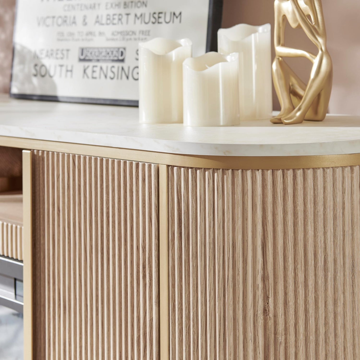 - DURABLE, WELL-FINISHED: Fluted panels are manufactured using blister molding techniques known for their high quality and consistency. The faux marble top is made of melamine veneer, which not only has a delicate texture, but also ensures long-lasting durability, water resistance and easy maintenance. And, the gold metal handles and cylindrical legs add to its contemporary vibe, creating a personalized and distinctive aesthetic.