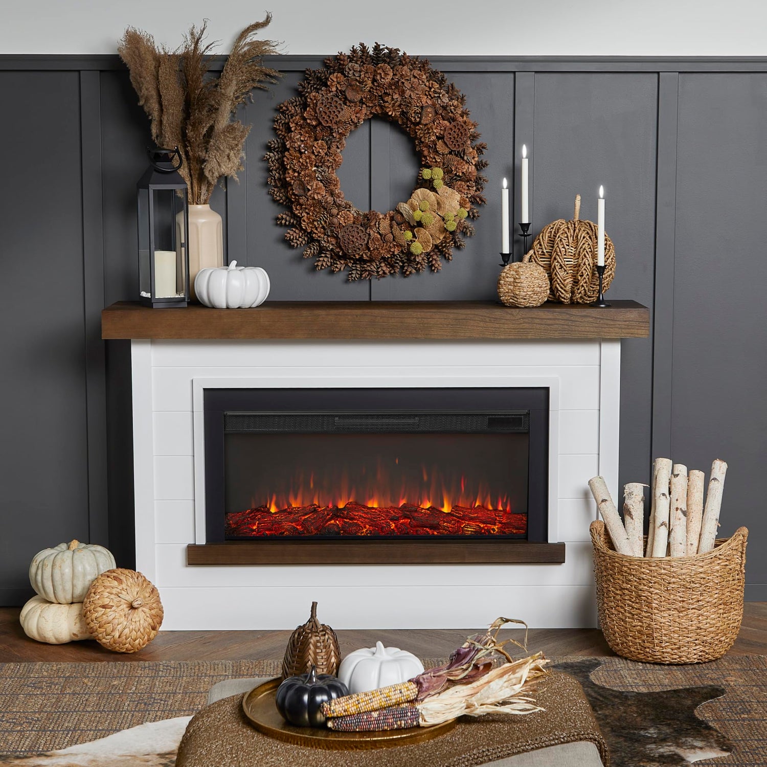 Details: Crisp, contemporary shiplap topped with a sturdy mantel gives the Bernice Electric Fireplace an inviting, modern farmhouse style. Part of the Real Flame Landscape Series, this widescreen electric firebox mimics the look of a real fire but does not require a chimney or vents and conveniently plugs into a standard outlet. Features include six flame color options, an adjustable thermostat and dynamic glowing embers.