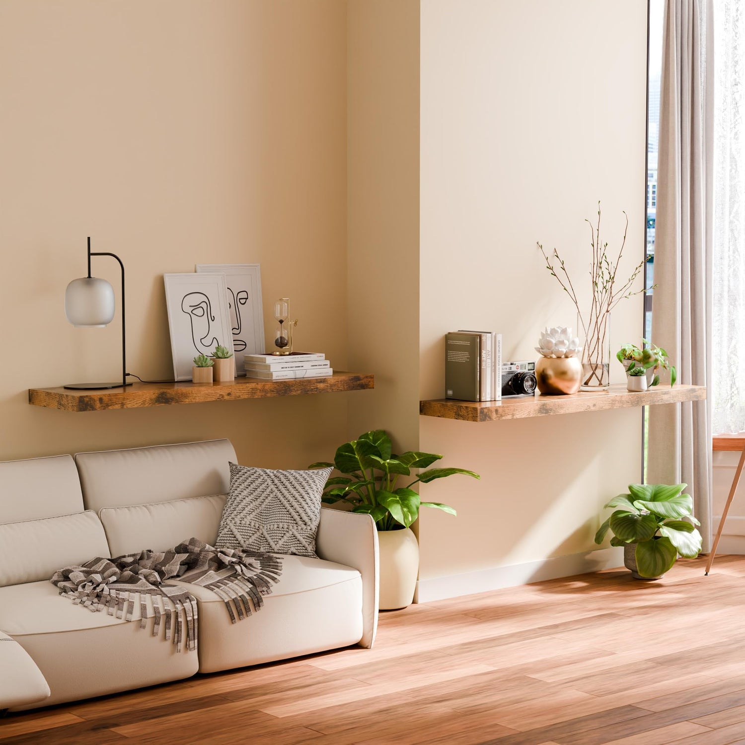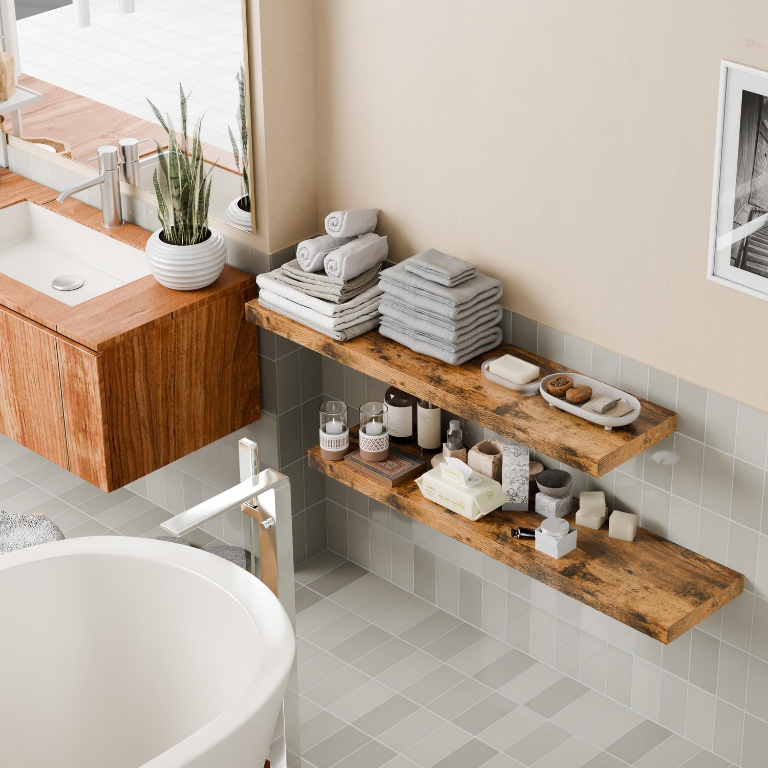 - Easy to install: You will receive 2 pieces of wooden shelves, 2 metal support rods, as well as an instruction manual and the screws you need to install. You only need to fix the metal support rod to the wall first and then connect the wooden shelf to it. Finally, screw the shelves and support rods together