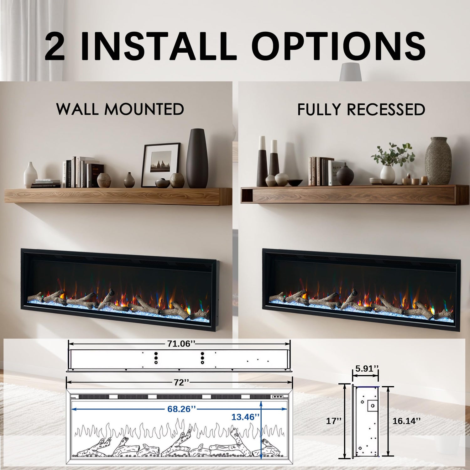 - Specification: Overall Dimension: 72’’W×17‘’H×5 29/32’’D, Recessed Size: 71 29/64’’W×16 11/32’’H×6 1/4’’D; 120V/60hz 15 AMP circuit required, 6ft power cable, for indoor use only, driftwood and crystal included