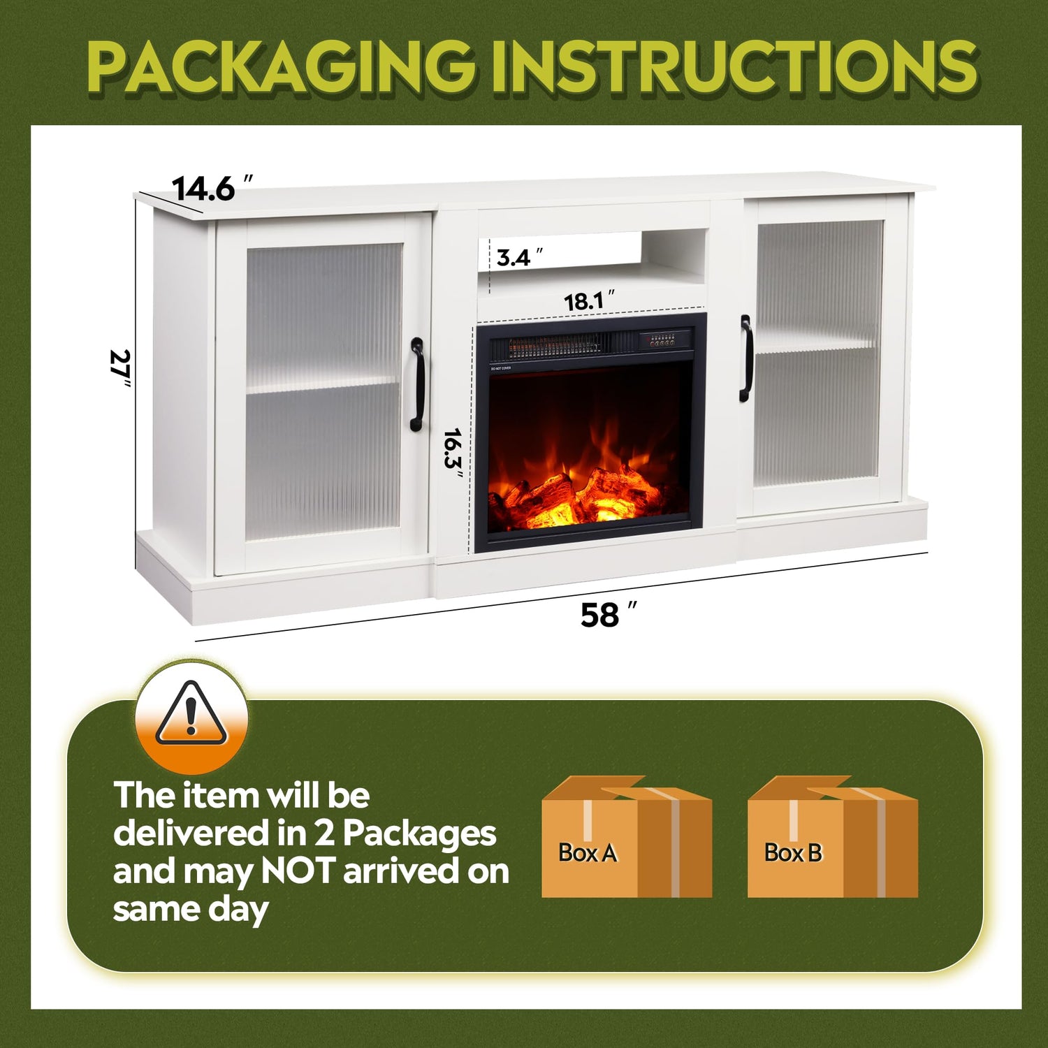 - 【Fireplace TV Stand with Heater】This 58 "W x 14.6 "D x 27 "H TV stand has a 18-inch built-in electric fireplace heater with 2-level heating adjustment, which has a great heating ytem kick off a lot of heat, setting a vibe of warm and stylish in the living room.The Media Center equipped with an auto shut-off timer that can be set for up to 7.5 hours.