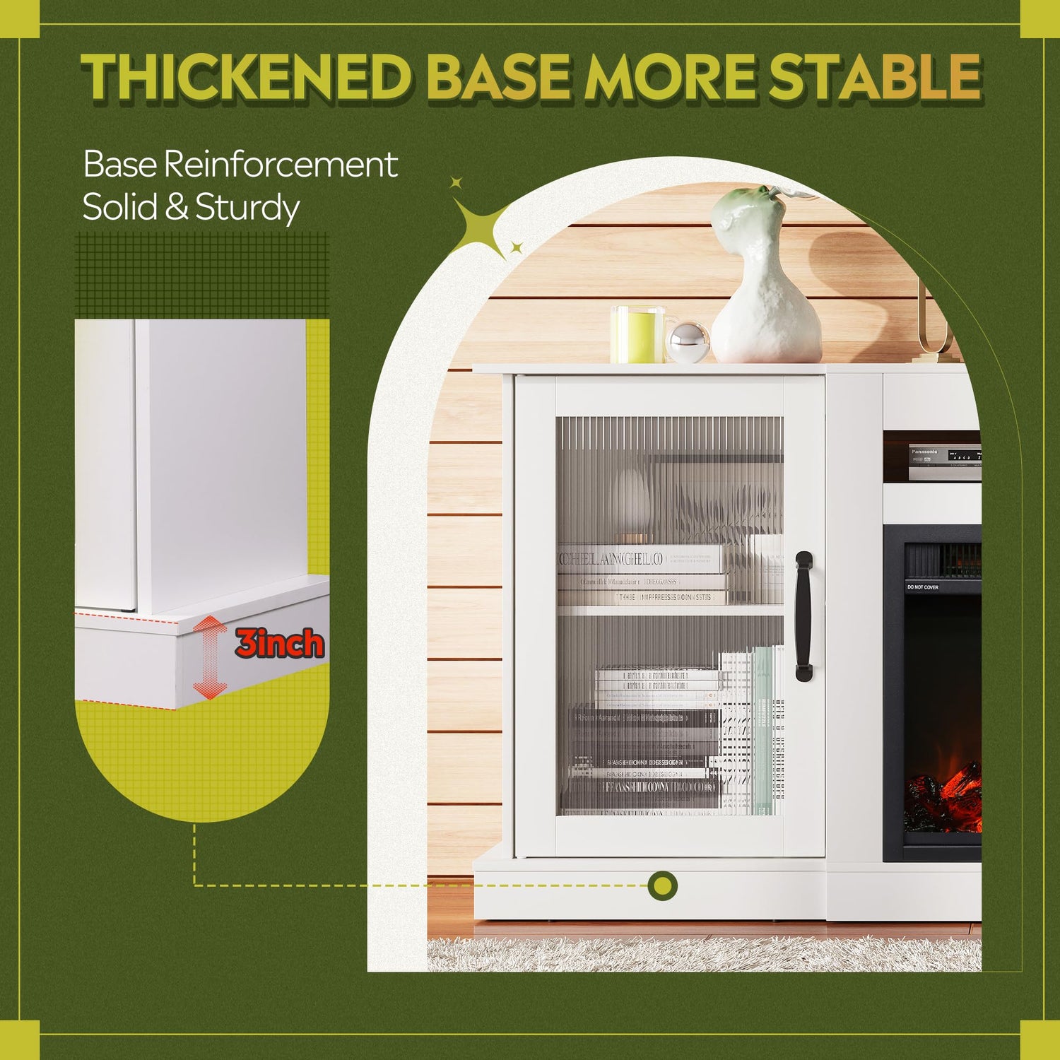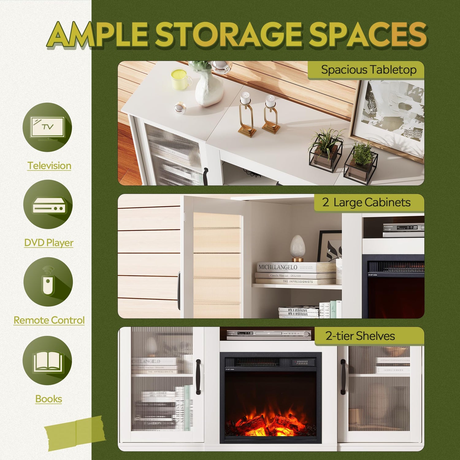 - 【Ample Storage】 The upper open space in the middle of the tv stand with fireplace enough to hold your game consoles, set-top boxes, DVD players and other items. With 3-level adjustable shelves on both sides, the large-capacity hidden storage space can meet your daily storage needs.