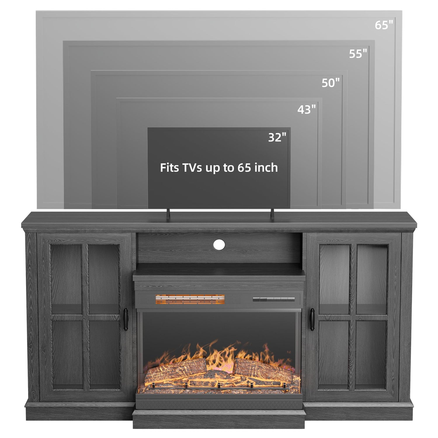 - YESHOMY Glass Fireplace TV Stand for Televisions up to 65", Media Entertainment Center Console Table with Doors Closed Storage, Black with Wood Grain