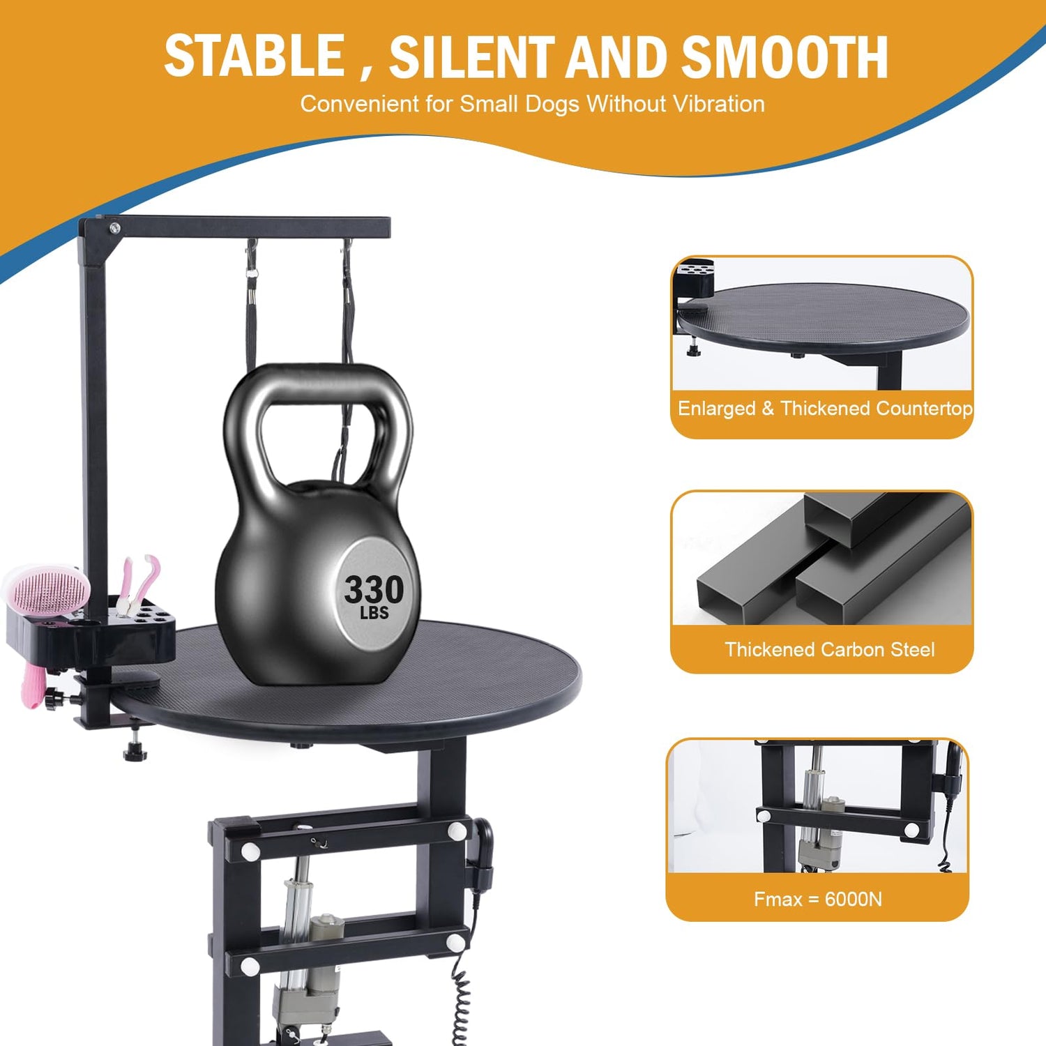 - 【SMOOTH AND QUIET LIFT】: Electric lift pet grooming table with powerful motor system and foot pedal and wired remote control. Adjusts smoothly and quietly from 27 to 38 inches in height. No need to bend down to groom your pet. Small and Medium dogs can easily get on and off the grooming table.