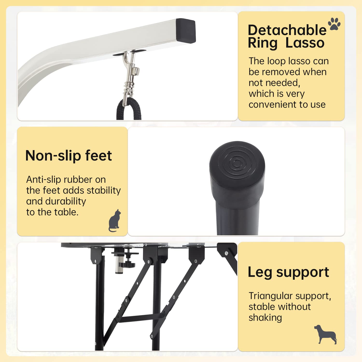 - đ¶ăHigh Safety Table TopăThis grooming table all metal part is made of high quality material the table surface is a waterproof material and non-slip texture that keeps your pet standing stable. The corners of the table are rounded to prevent your pet from being unnecessarily hurt in the struggle. In addition, the non-slip rubber on the feet increases the stability and durability of the table.