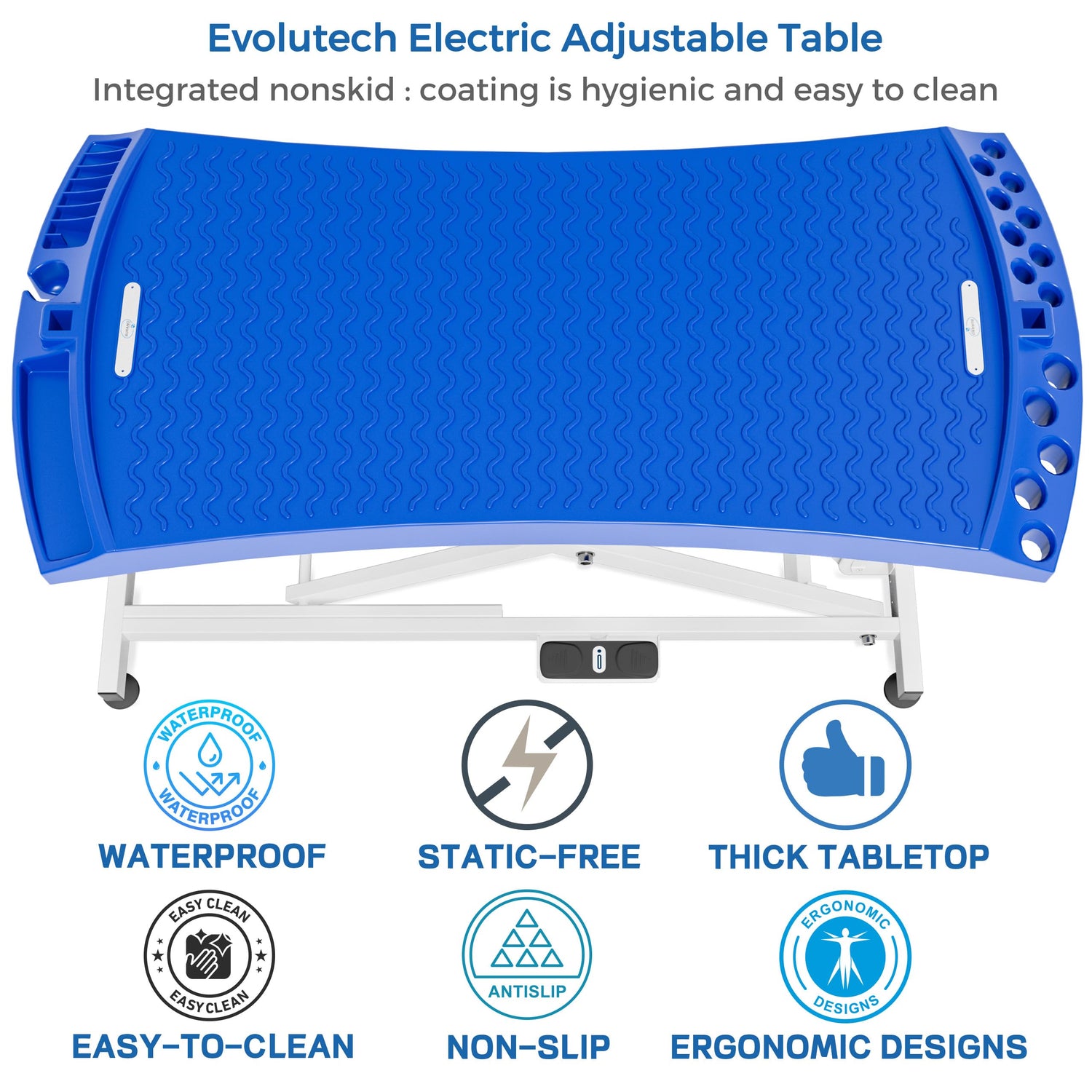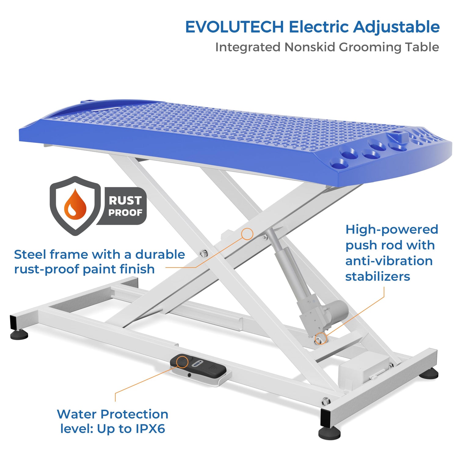 • THE EVOLUTECH GROOMING TABLE is the ultimate solution for professional groomers. The Burano grooming table features an integrated nonskid coating that is hygienic and easy to clean. It has an adjustable height range from *** to 43 inches, making it easy to handle large, heavy dogs. Its electric height adjustment ensures a stable, wobble-free experience, ideal for grooming dogs of any size.