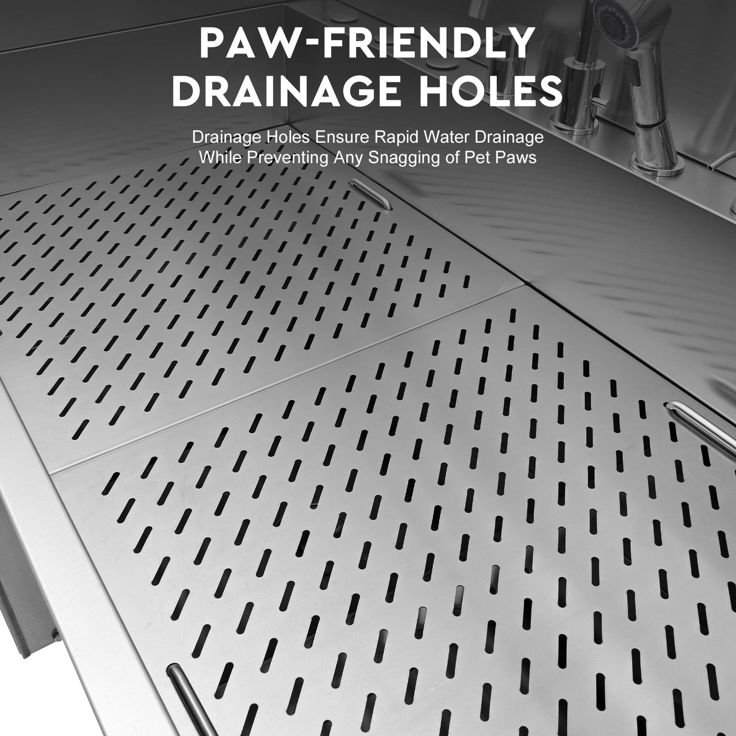 - Retractable Ramp: This dog grooming station's retractable nonskid ramp ensures safe and joint-friendly entry and exit for pets of all ages, even when wet. With a gentle incline, it reduces your pets' anxiety for a stress-free bathing experience