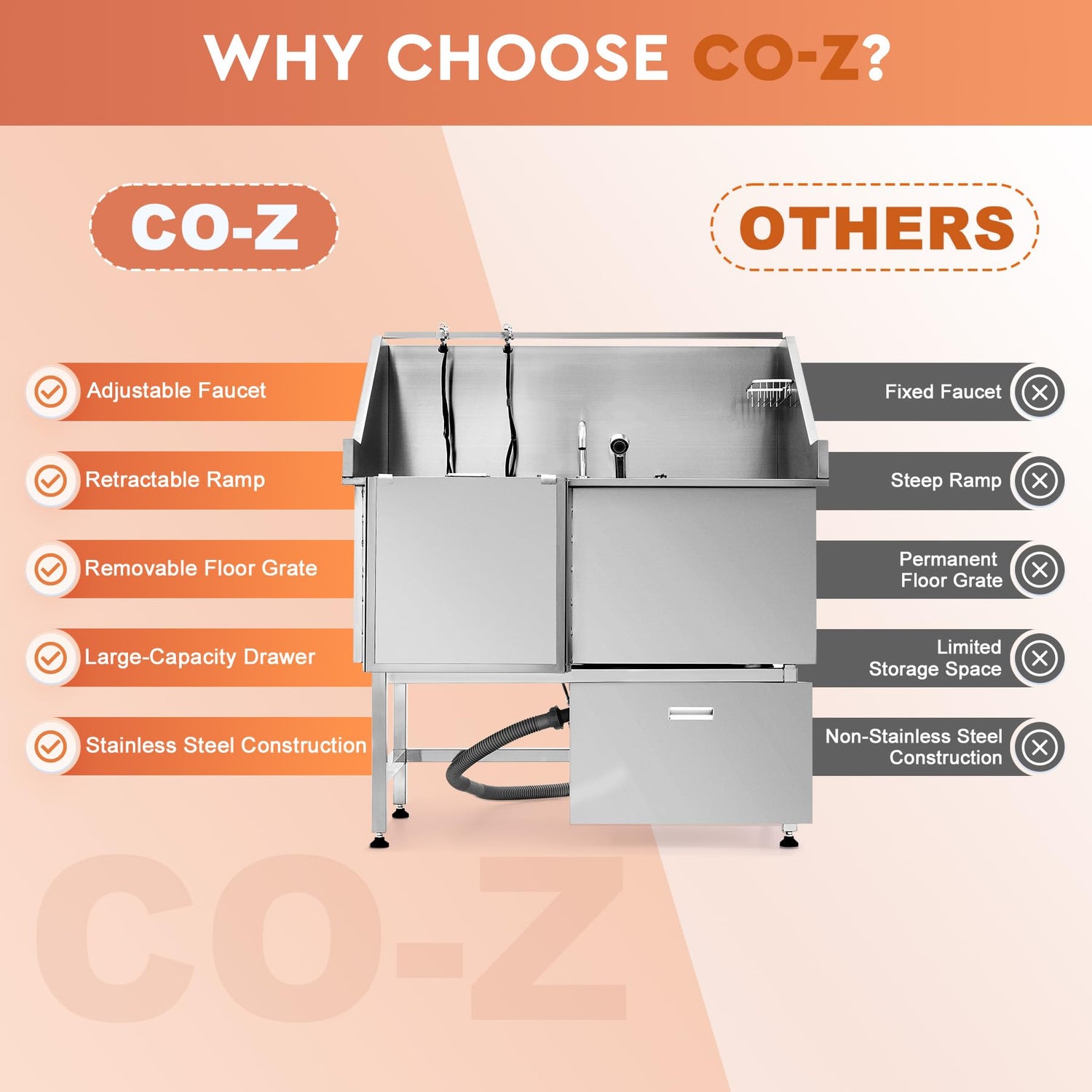 - Pet Bathtub for Large Dogs: This 50 in. professional dog bathing station from CO-Z provides a fun and hassle-free bathing experience for you and your large furry pals with its spacious storage drawer, textured ramp, and 2 sprayer settings