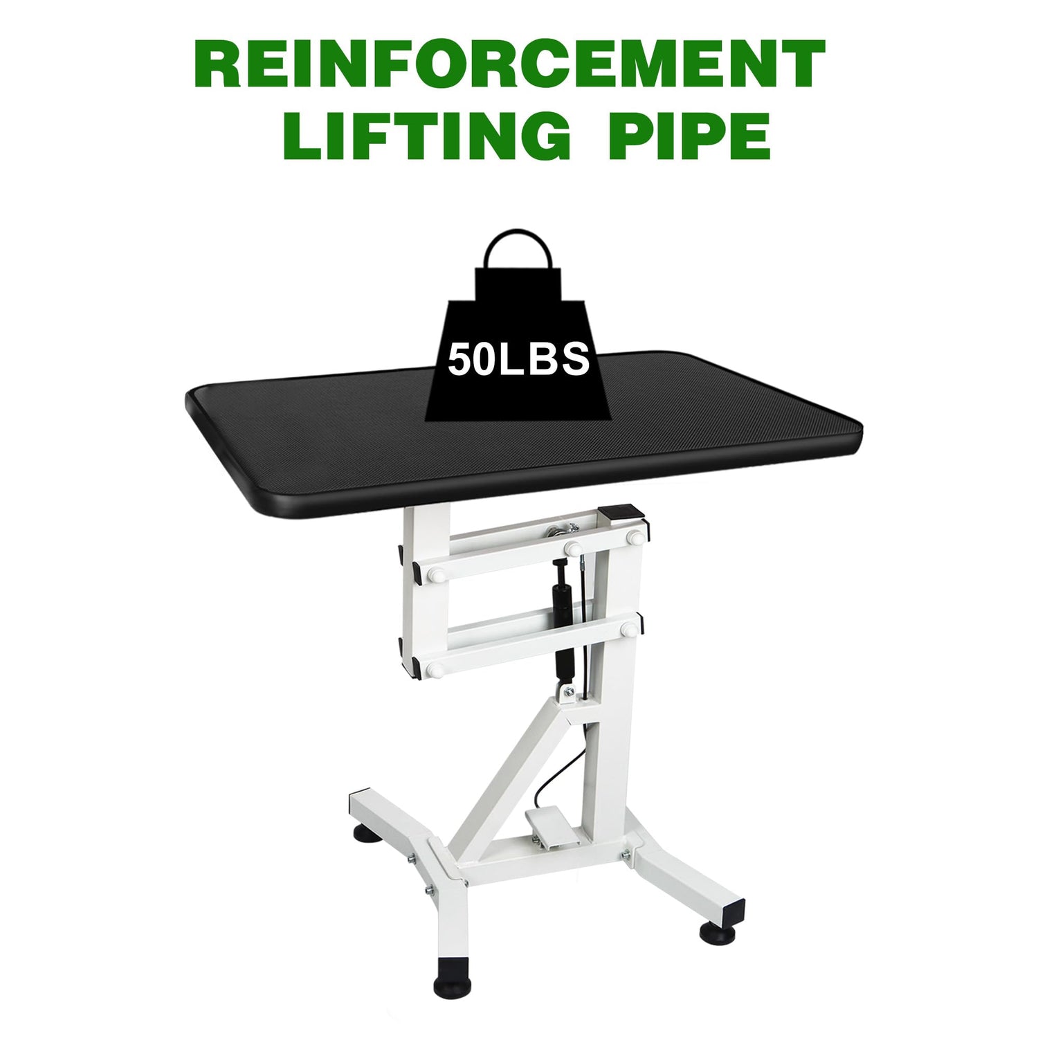 - 【Pneumatic Grooming Table】This pneumatic grooming table is perfect for use at home. The tabletop size is 31" x19.6"x lifting height 27.5"-39", the tabletop can be rotated, and the foot-operated pneumatic lifting can easily adjust the height of the pet so that you can easily give him a bath, trim, dry, comb or other pet care.