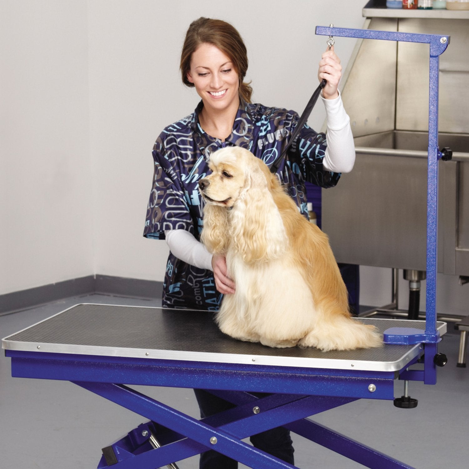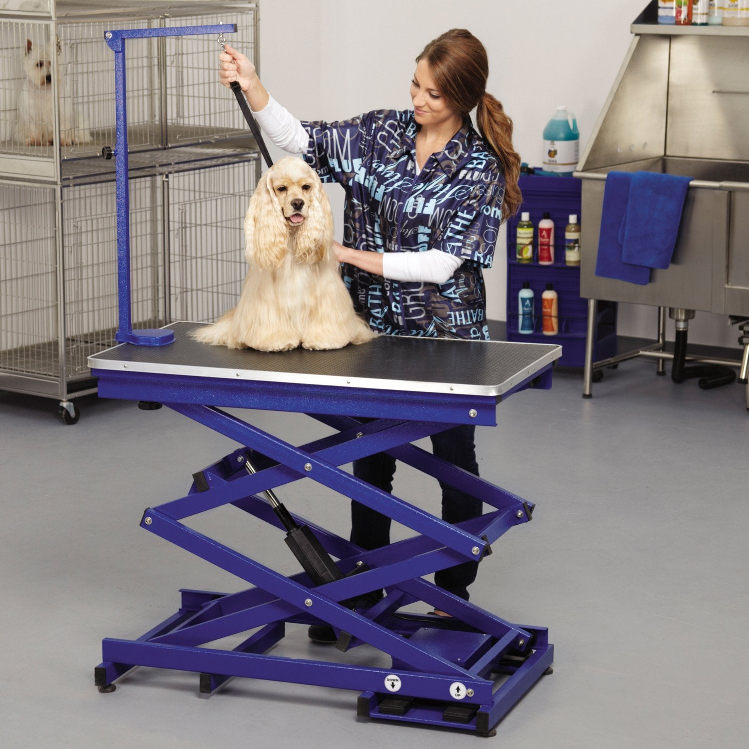 Details: Grooming pets of all sizes has never been easier than with the Master Equipment X-Tend Electric Grooming Table. Special accordion-style lift mechanism quietly and smoothly adjusts in height from 11" to 43½", and is capable of lifting up to 200 lbs. The Master Equipment X-Tend Electric Grooming Table makes grooming easy on your back. Now available in new blue and purple styles.