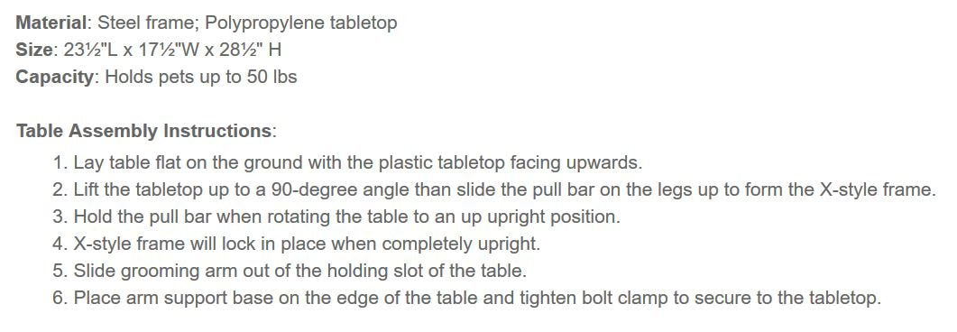 Details: Our Master Equipment Versa Competition Table is one of the only competition tables on the market that comes with an adjustable grooming arm. Compact yet very durable, this pet grooming table features a non-slip pawprint tabletop and a powder-coated steel frame with non-skid feet prevents the table from wobbling. • Uniquely designed with a FREE adjustable grooming arm and loop • X-style frame with non-slip feet • Easy clean polypropylene tabletop • Folds quickly for easy transport Material: Steel frame; Polypropylene tabletop Size: 23½"L x 17½"W x 28½"H Capacity: Holds pets up to 50 lbs.